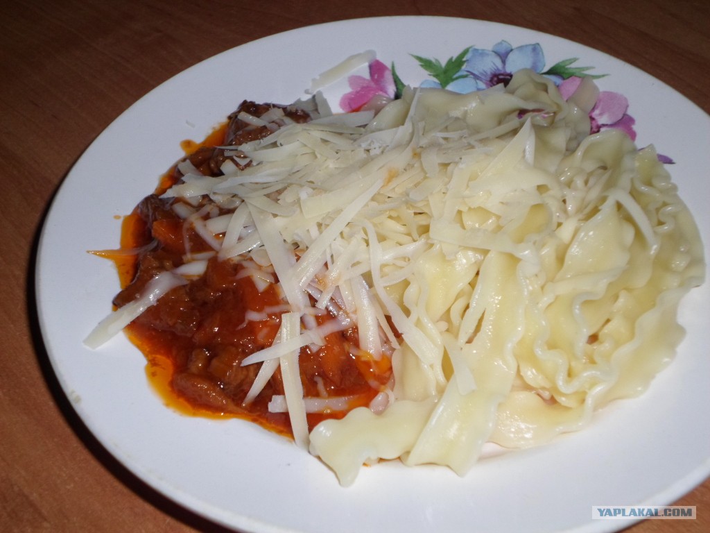 В оригинальном рецепте пасту и рагу смешивают и томят минутки 2 на огне и потом подают на стол. Но, (прости меня Марио gentel.gif) что то мне решительно захотелось отделить одно от другого. И подать в классическом нашем (советском) варианте. Так что, можете меня ругать, вот такой я фулюган rulez.gif ))))))