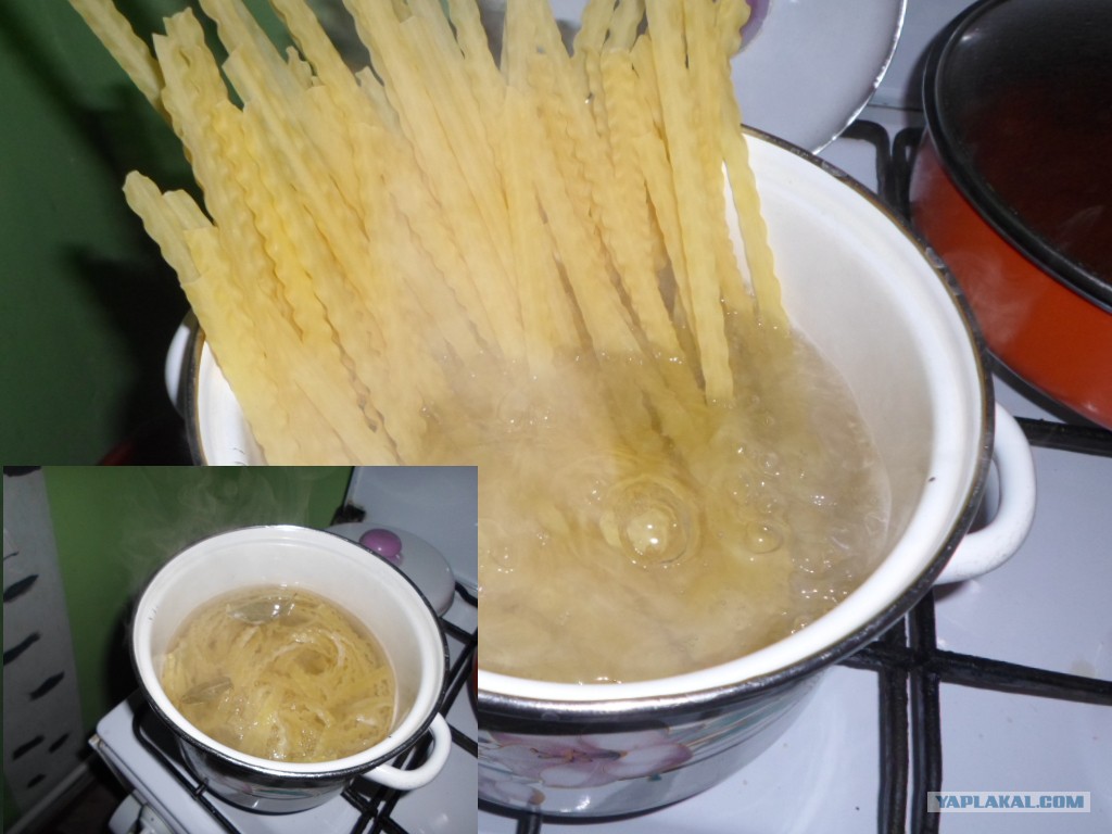 Перед тем как закинуть мясо, вода закипела и я был вынужден отдать ей на «съеденье» пасту, ух сильно возмущалась кастрюля, закусывая дополнительно 2 листочками лаврушки gentel.gif