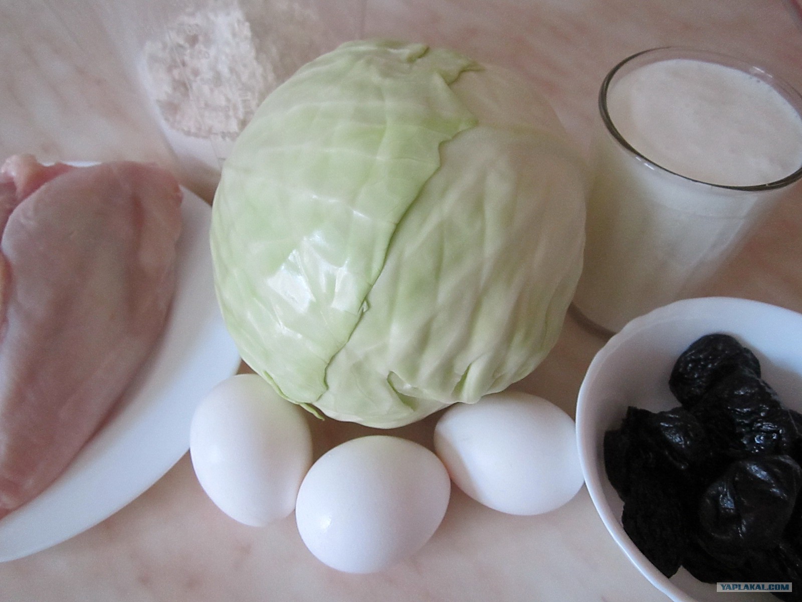 Нам понадобится 1,5 ст. кефира, 250-300г. муки, 3 яйца, соль, сода, капуста, курица, чернослив.
