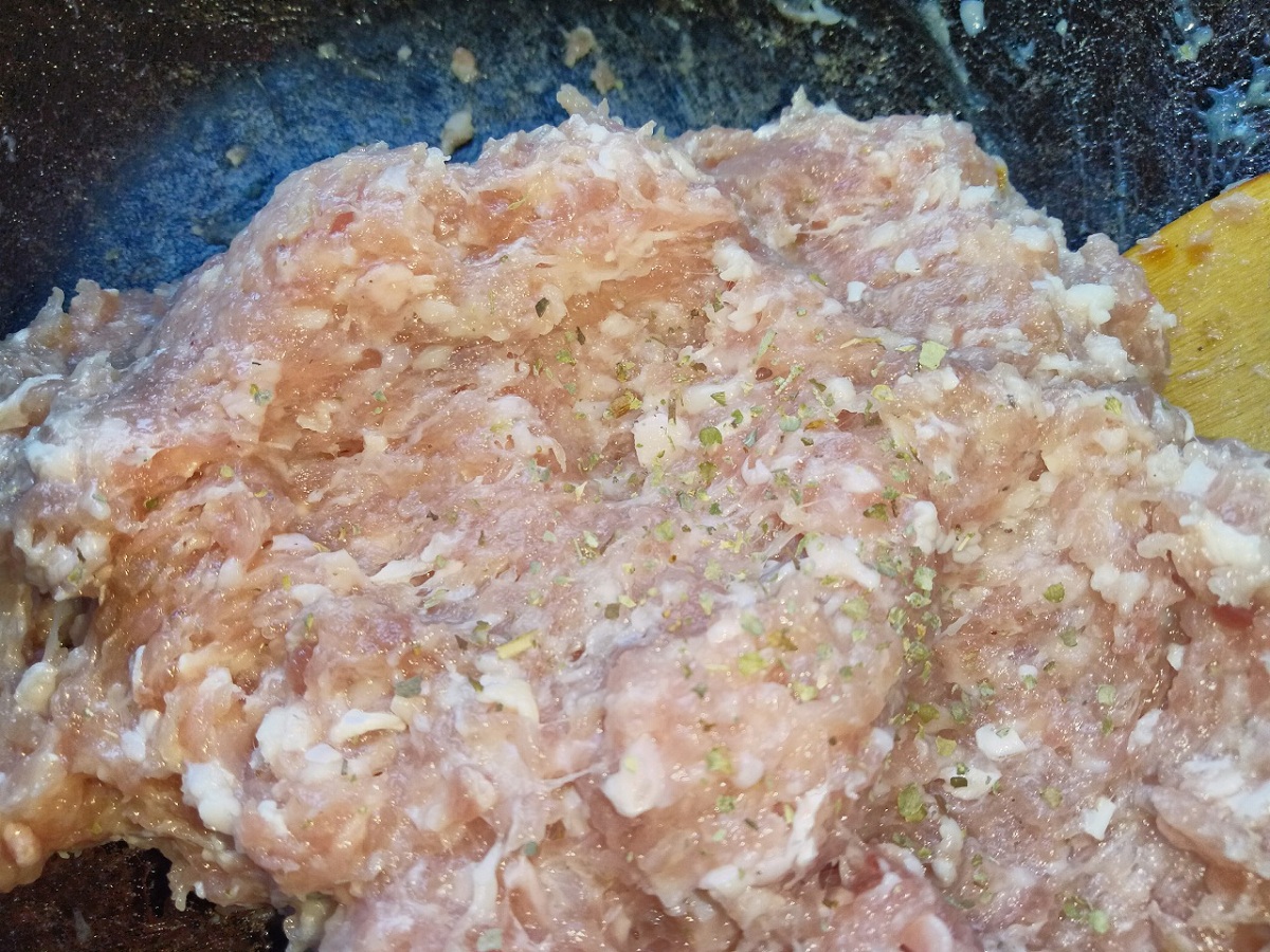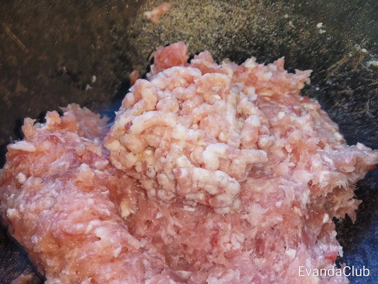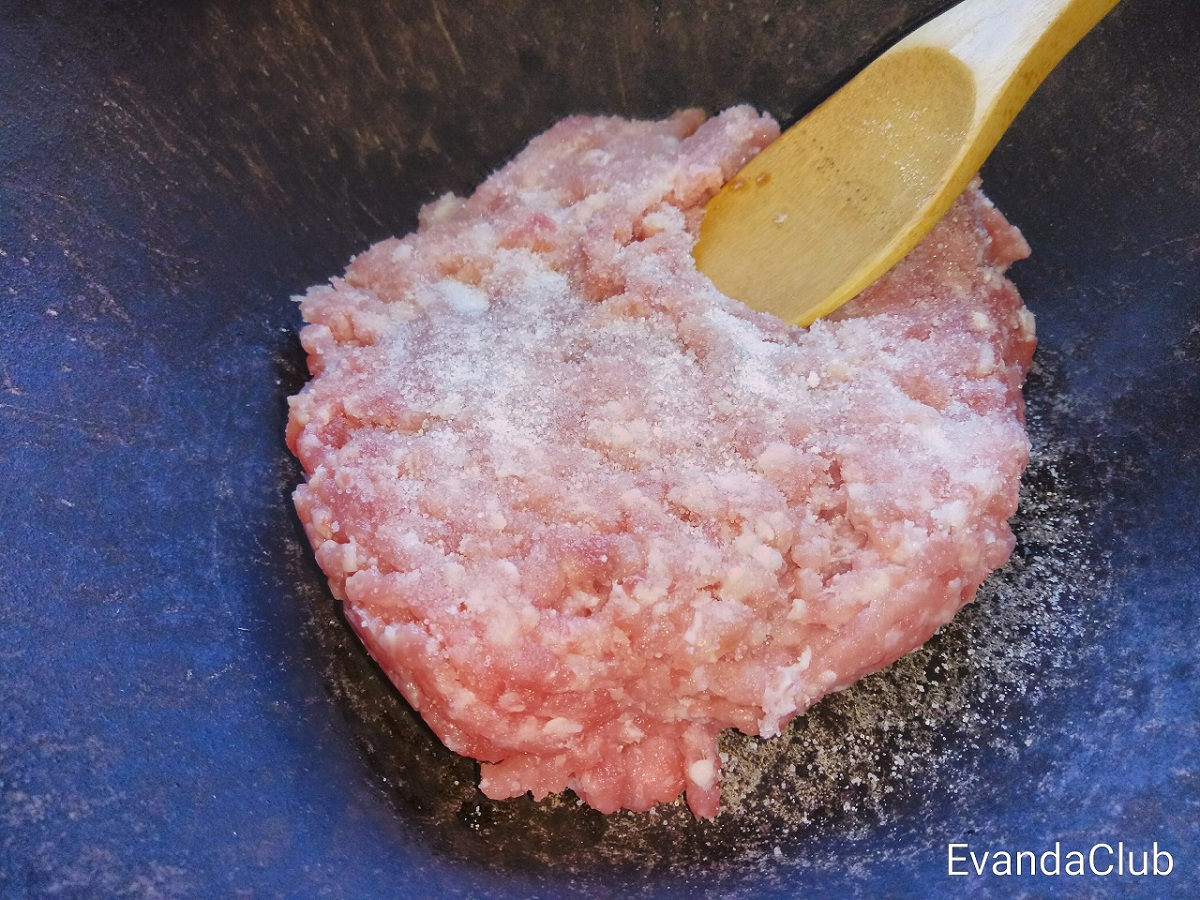Вымесив минут 10 добавил он грудинки, чтоб пожирнее да повкуснее было, месил он еще минут 10