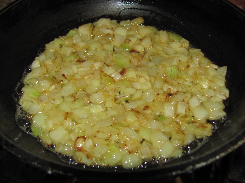 В оригинальном варианте в тесто Дженибек лук закидывал сырым. Но меленько нарезанным. А я вот возьму с половину лука (можно меньше) и поджарю отдельно. И в сторонку – остывать. А мне так больше нравится! old.gif