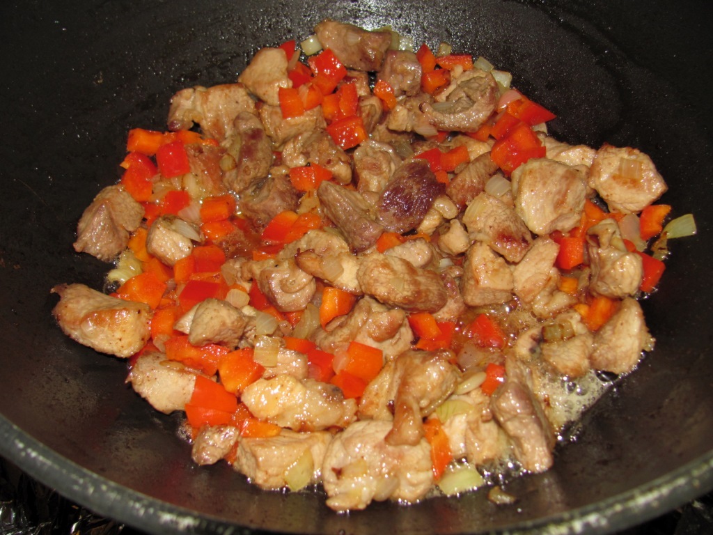 А в казане раскаливаю тем временем масло. Нет казана? Ну не страшно. Можно в сковородке, потом в кастрюлю пересыпем. Раскаливаем-раскаливаем, и начинаем жарить мясо. Да на хорошем огне, чтобы обжарилось и сок не успело пустить. Вот у меня успело маненько cry.gif