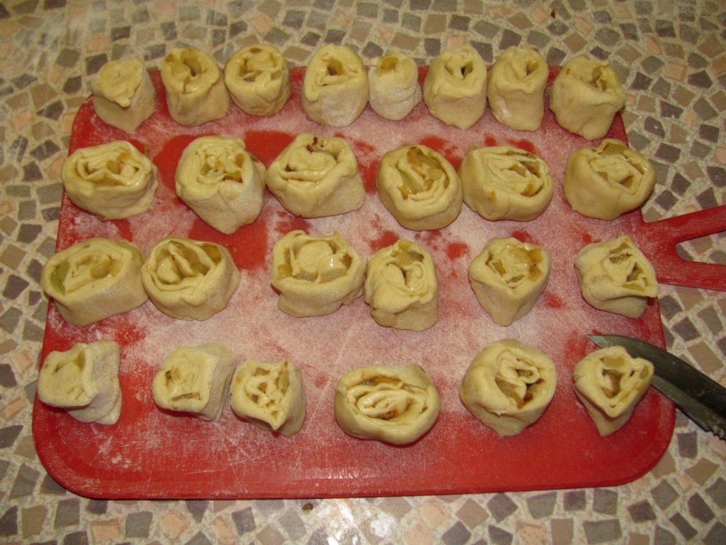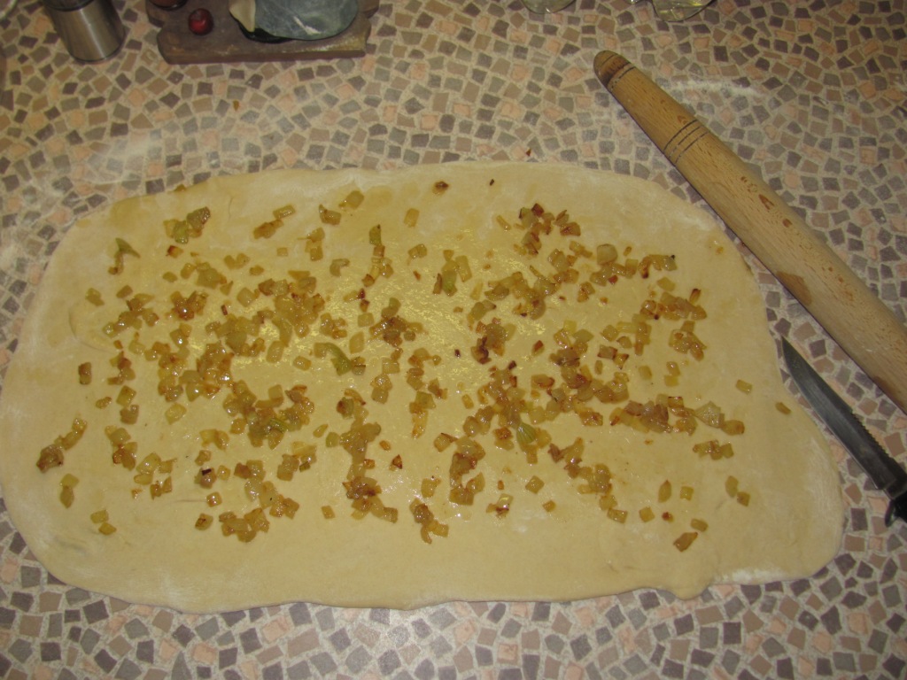 На раскатанное тесто равномерно распределяем поджаренный лучок и скатываем колбаской. Или рулетиком. Вобщем – скручиваем плотненько. И край теста защипываем по длинне, чтобы не рассыпалось в процессе.