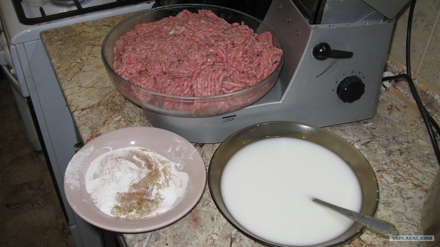 1. мясо на фарш крутил сам, в сильно охлаждённом виде - в момент готовки жира и сока в корытце почти не было. Фарш брал 50/50, свинина была почти без жира.