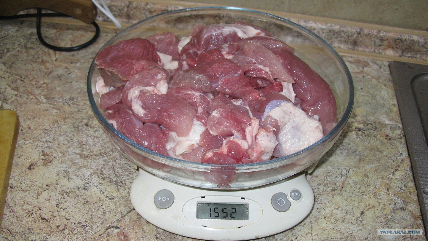 Всё по рецепту первого поста, в пересчете на вес мяса.