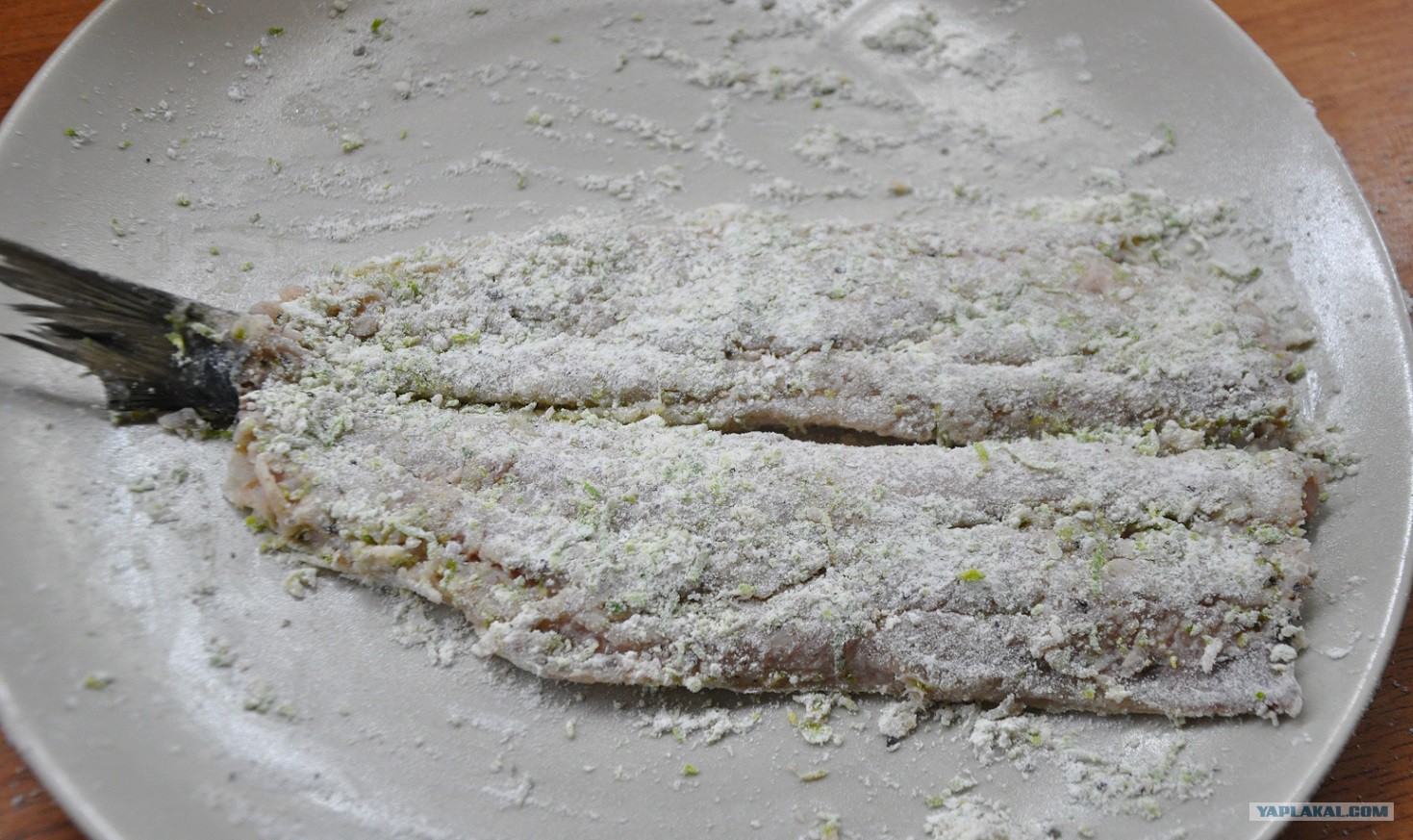 У размороженной селедки убираем голову, внутренности, плавники и хребет вместе с костями. Последнее делается легко, одним ловким движением. Со шкуркой вообще ничего не делаем. Обваливаем рыбку в лаймовой панировке.