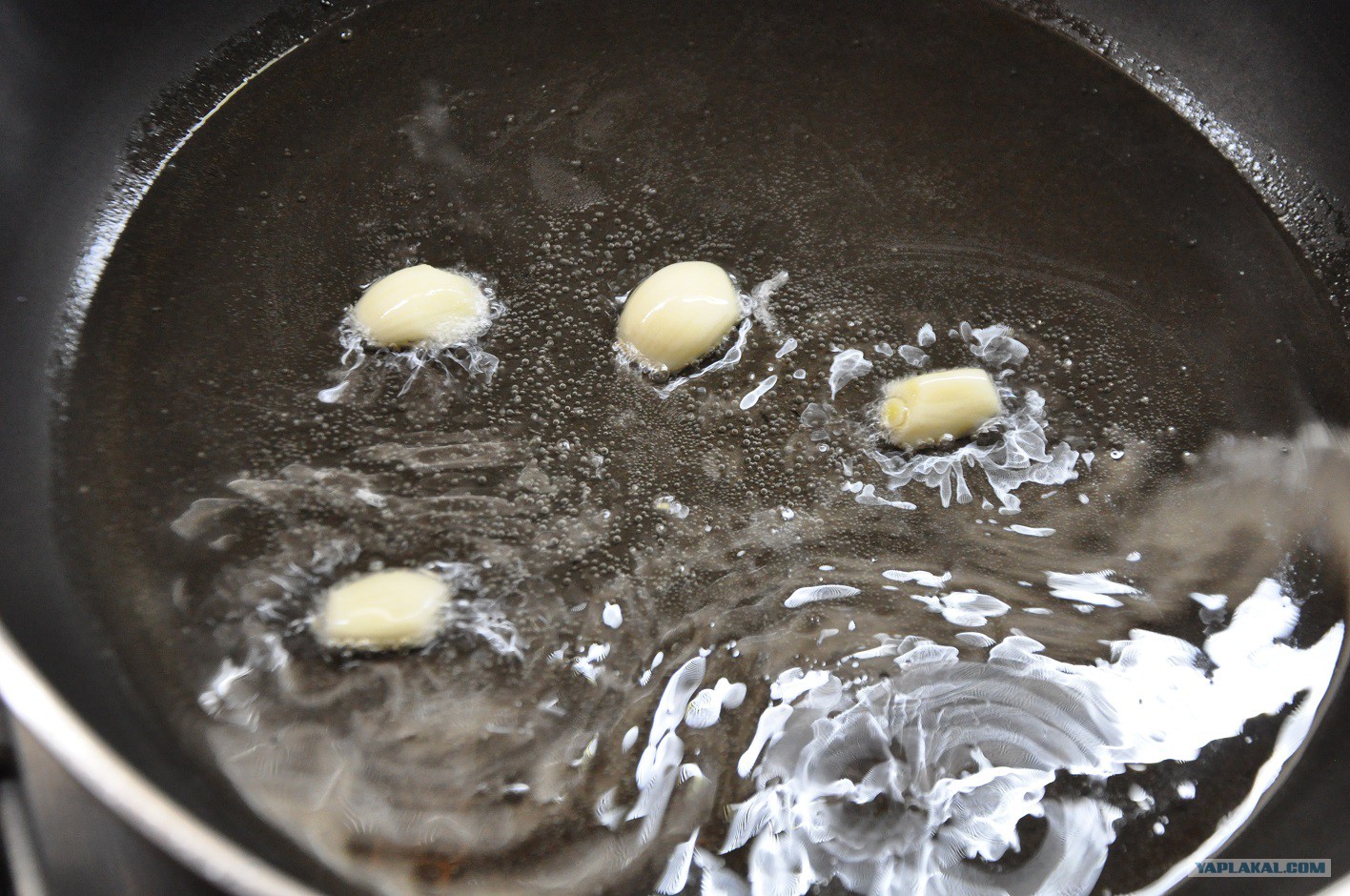 Нагреваем масло или жир. Зубчики чеснока делим пополам, обжариваем в масле до золотистости и выкидываем.