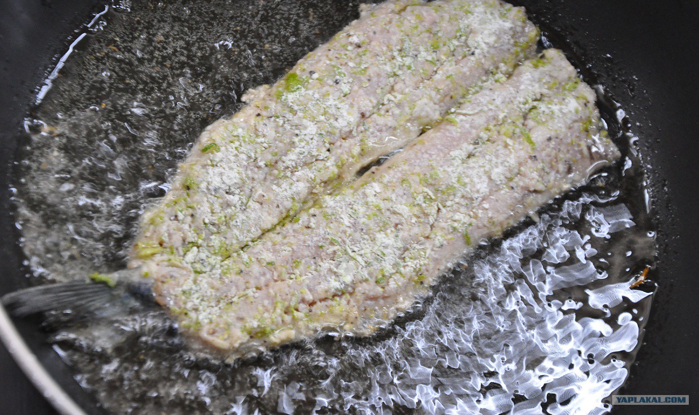 Сковороду с маслом на максимум! Выкладываем филе сельди шкуркой вниз и обжариваем до корочки. У меня это заняло полторы минуты. Присматривайте за ней во время обжарки и постарайтесь не пересушить, ибо это смертный грех!