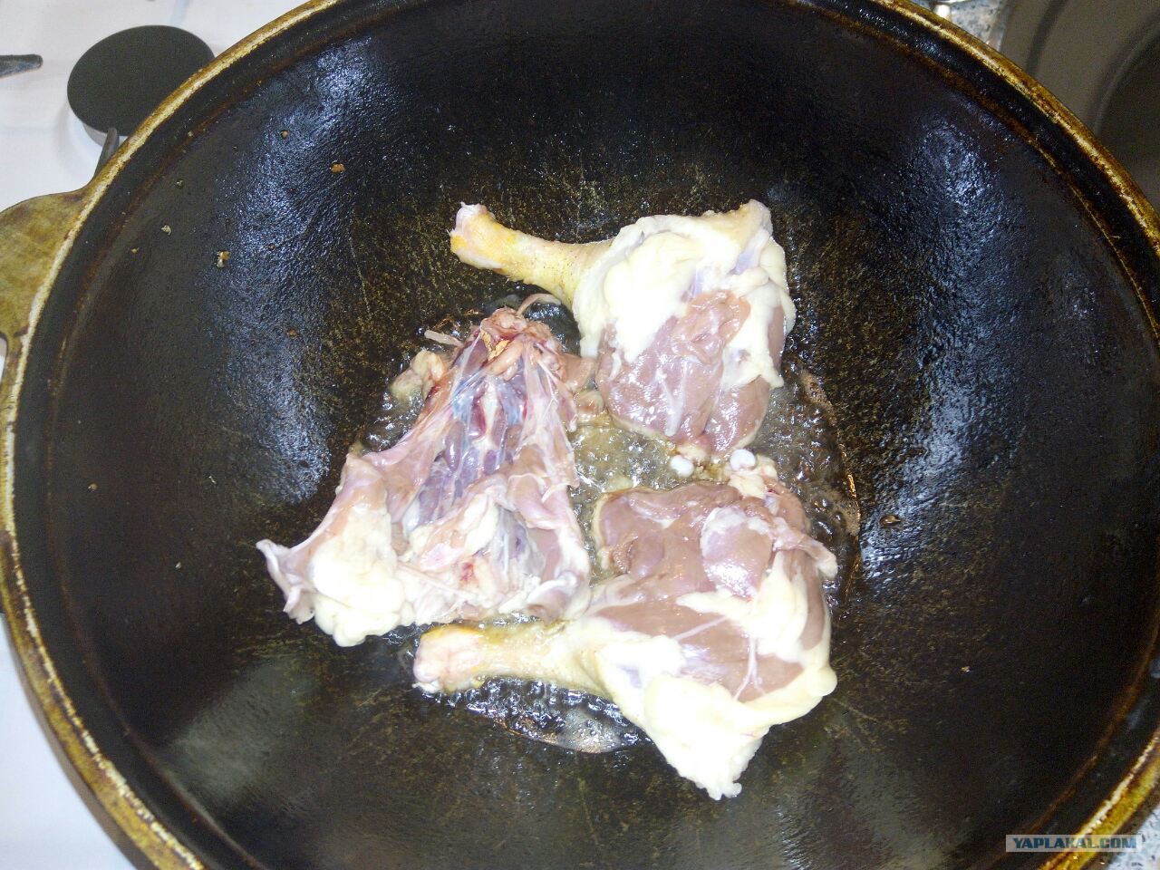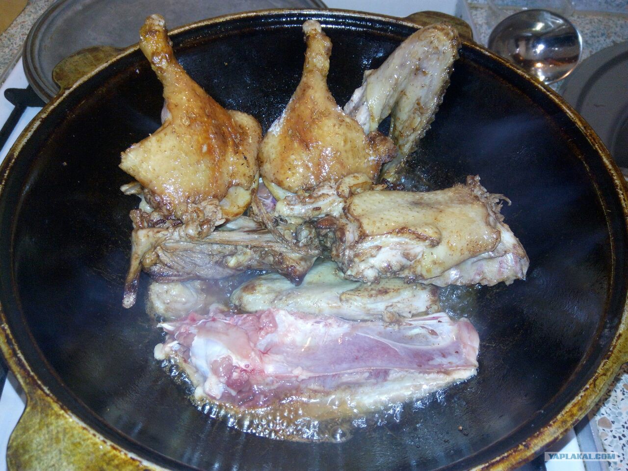После поедания и облизывания пальцев приступил к утке, по одному кусочку выкладываем в казан шкурой вниз и обжариваем до красивой корочки.