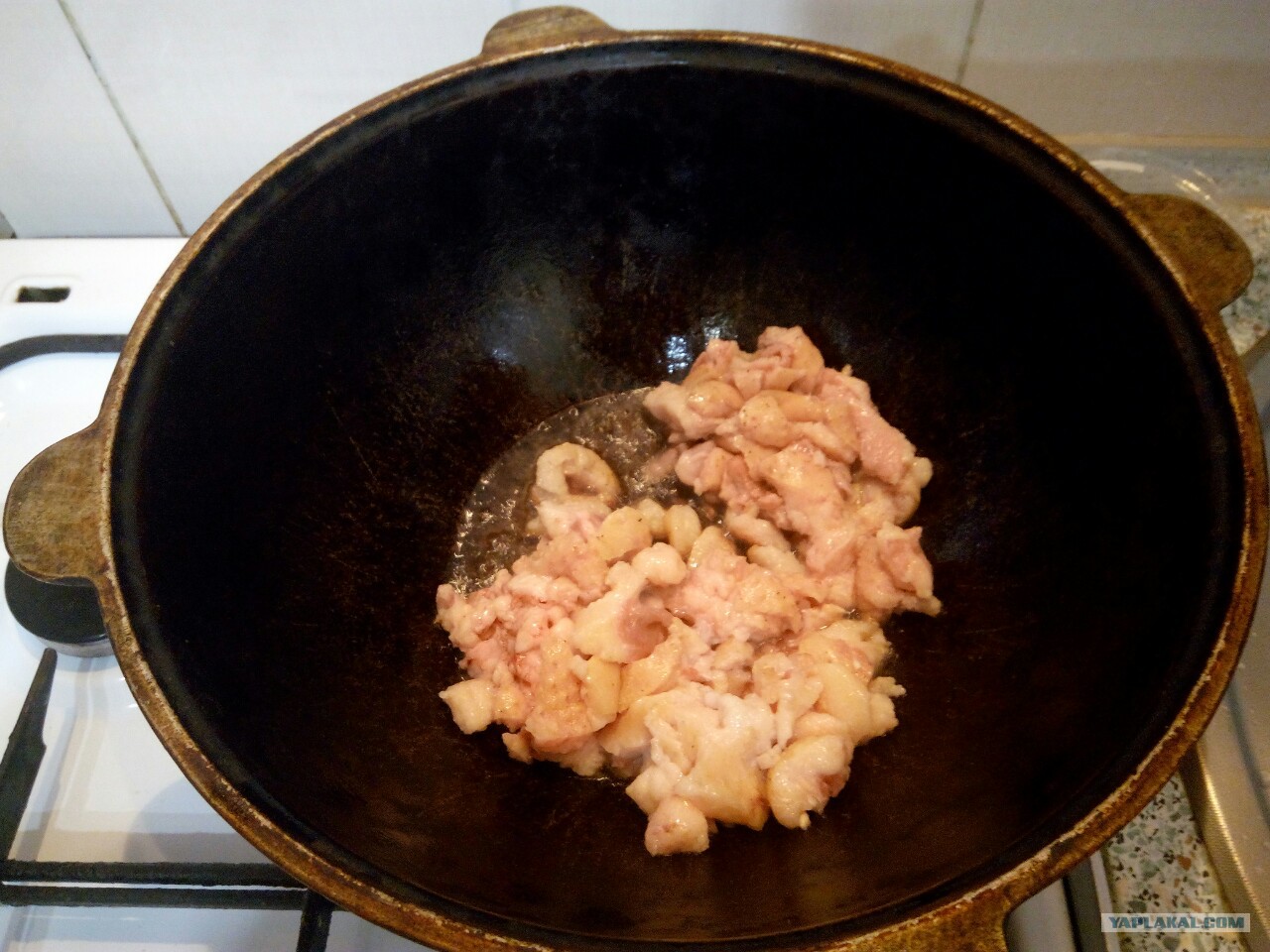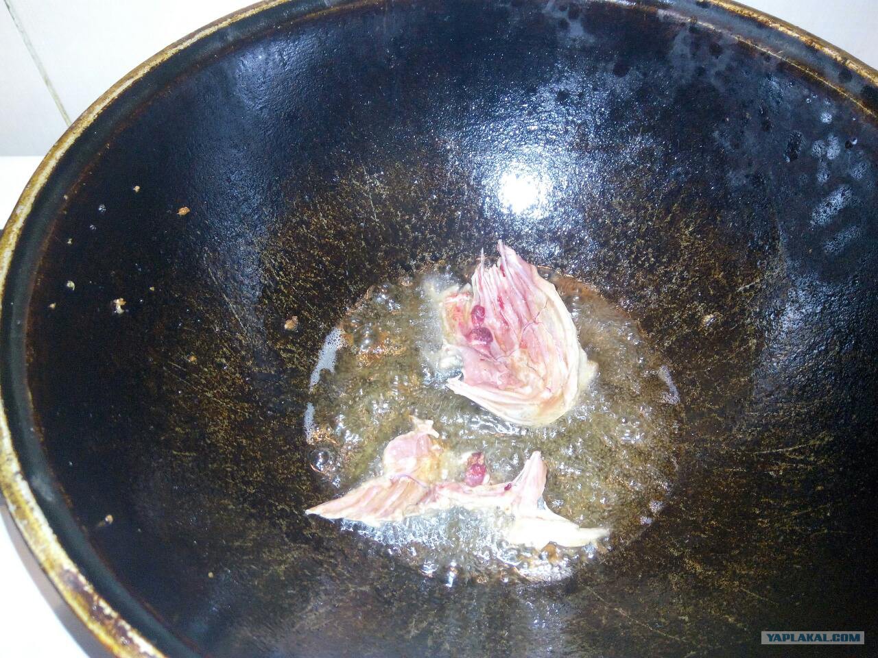 Жир и лишнюю кожу срезаем, мелко режем и в казан. Он должен быть чугунный, тяжёлый и пропитанный не одним десятком зерваков. Иначе это блюдо нанайцы на смех поднимут. В моем случае даже привезен из Душанбе и не раз освящен приготовлением данного блюда и, конечно же, плова. Обжариваем до появления аппетитных шкварок и уничтожаем их по мере готовности, мы уже заслужили попробовать что-то вкусненькое.