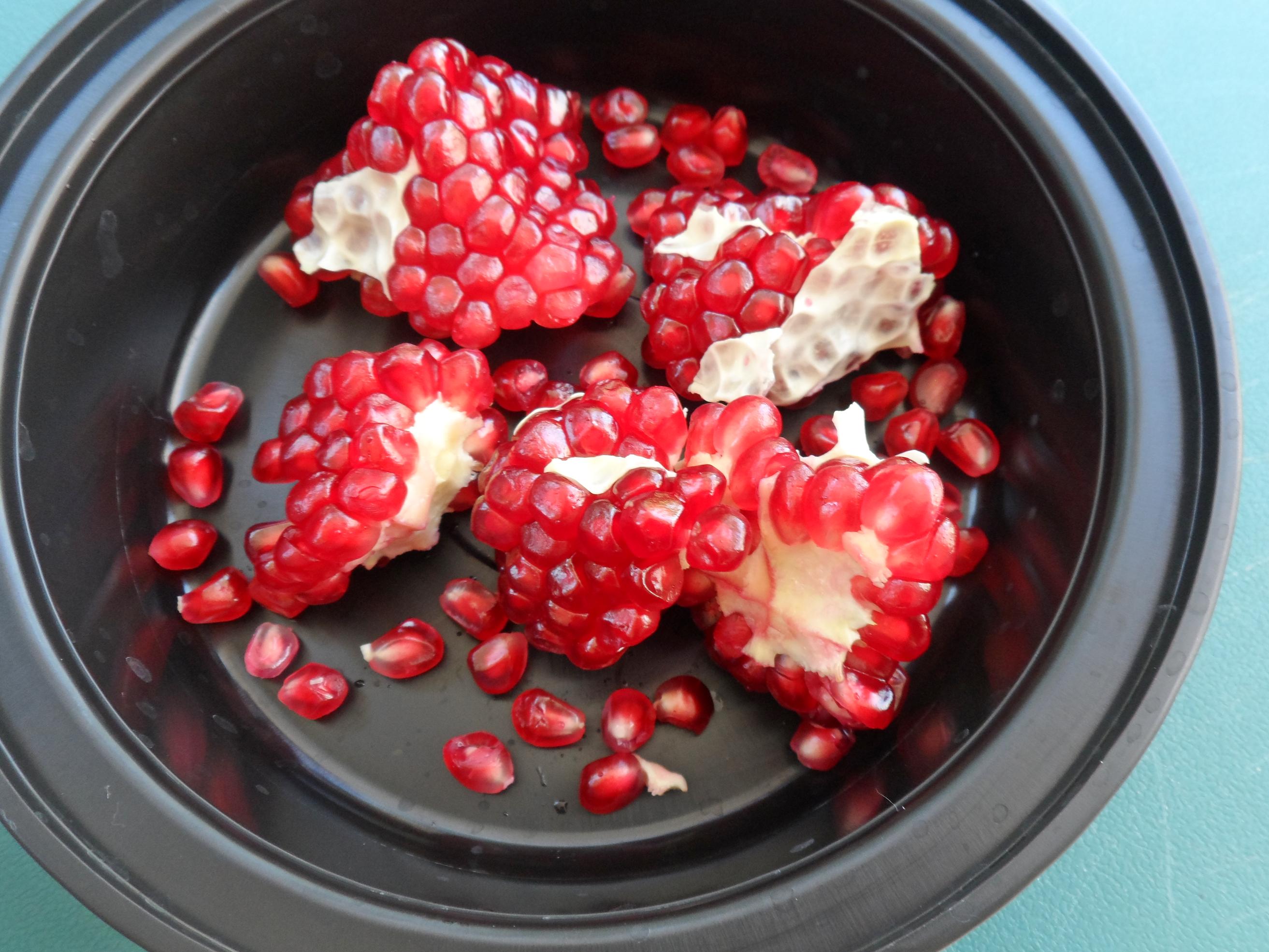 Капуста, гранат, пара яблок (лучше - кислые и зелёные, но, уже какие были), изюм, орехи, шоколад, Ваш любимый Фрут энд Нат соль, перец, сахар, мёд и соевый соус. То, что было дома на тот момент, потому что в гости надо было собираться быстро и бежать за другими продуктами было некогда: