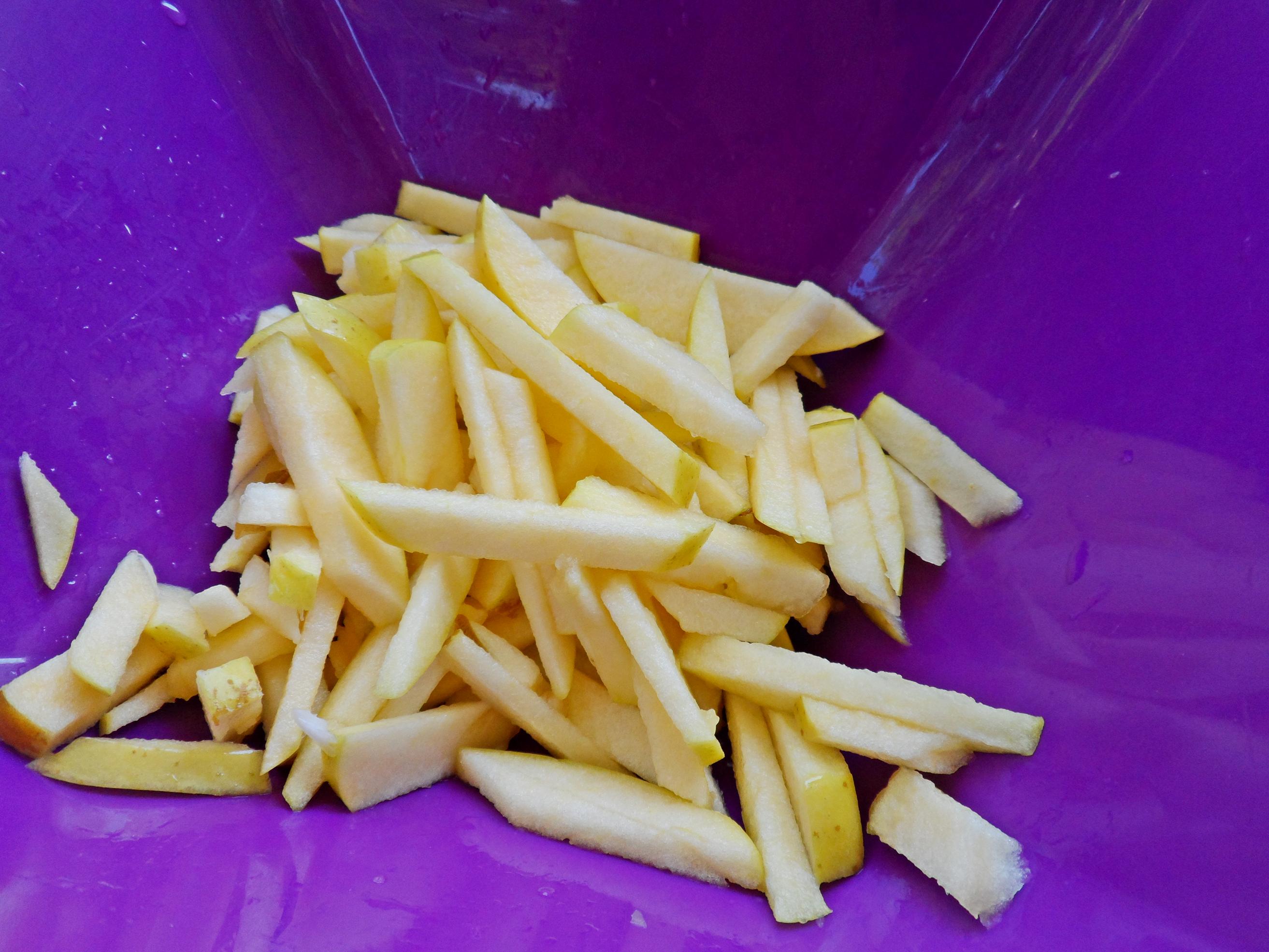 Яблоки нарезаем соломкой или как получится. У меня "или как", и брызгаем на них лимонным соком.