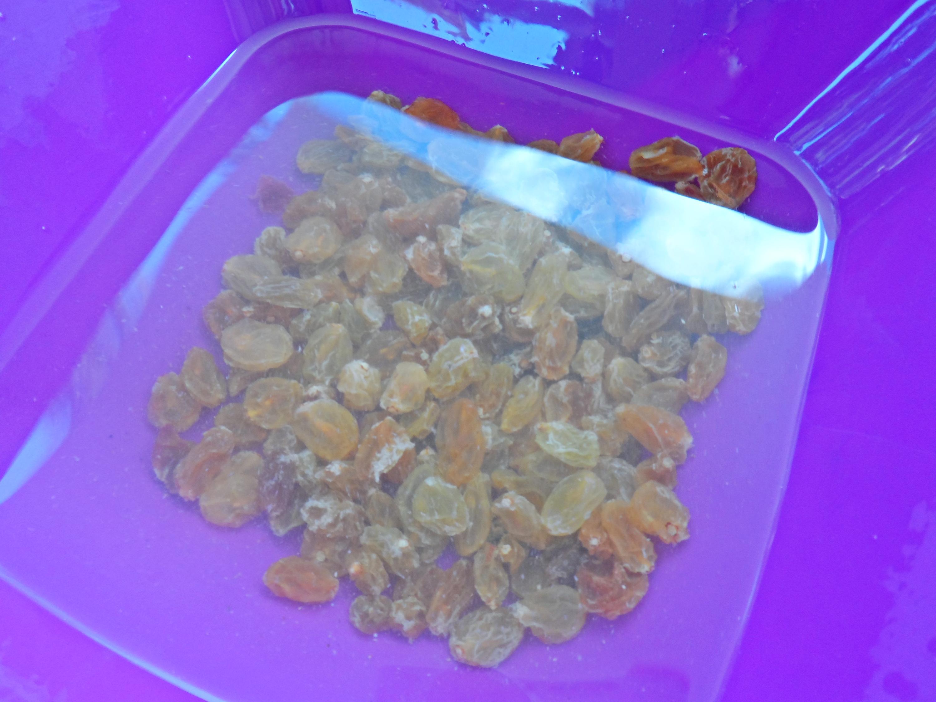 Изюм заливаем кипятком. Можно дать постоять, я просто промыла, он и так был мягкий: