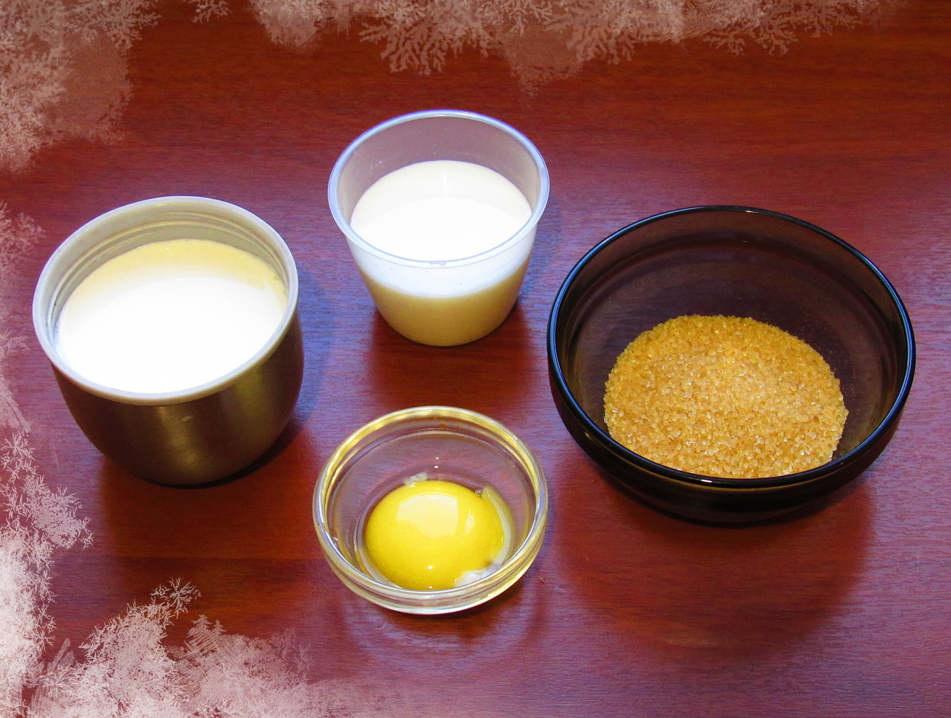 7. Подготавливаем ингредиенты для мороженого: молоко, сливки, сахар и яичный желток.