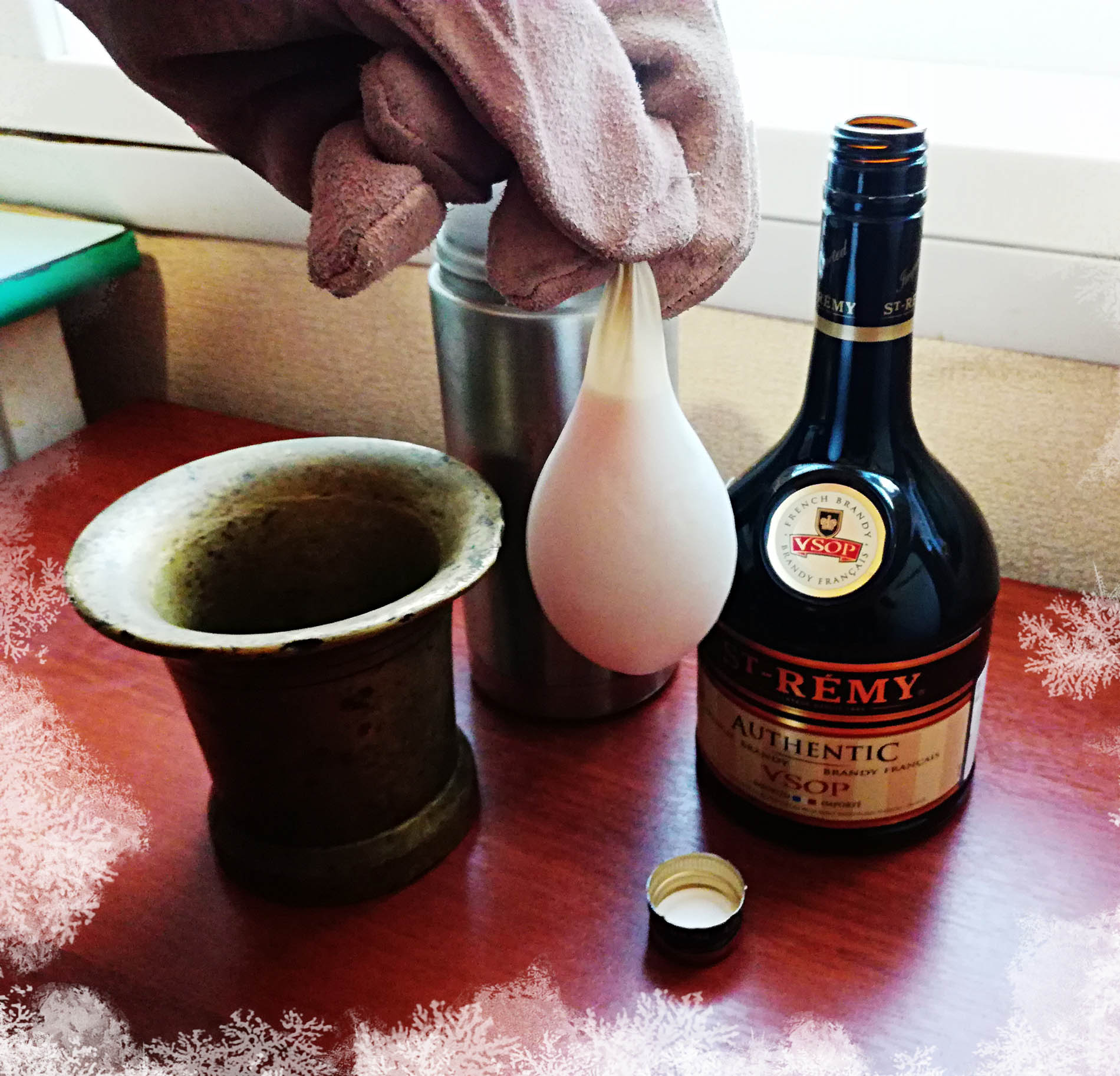 14. В заранее промытый от талька воздушный шарик наливаем 80-100 мл бренди. Перед этим действием шарик желательно надуть, чтобы он в сдутом состоянии имел больший объем.