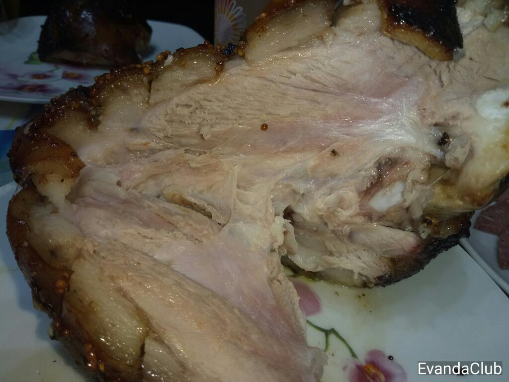 Вывод. Да, вкусно, особенно шкурка, особенно где подгорело. Но. Мясо как по мне суховато, это видно по фото, жаль нет для сравнения моей в разрезе. Готовить подобное однозначно буду, очень удобно сегодня сварить, а завтра запечь за час-полтора. Обмазка у меня была мед, горчица дижонская, bbq соус, террияки, соль. Шкурка бесподобная.