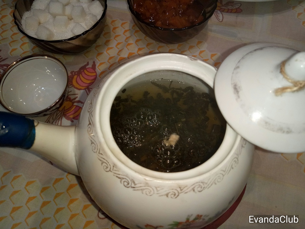 Неизменным атрибутом является заварочный чайник. Мой - старше меня и видавший виды, привезен из Душанбе, там же был починен его носик. Естественно синей изолентой. Также было принято крышечку привязывать на веревочку, в современных чайниках нет такой необходимости, а в старых при наливании чая крышечка могла соскользнуть. Мама обычно придерживает крышку при наливании, но я вам изобразил с ниточкой.