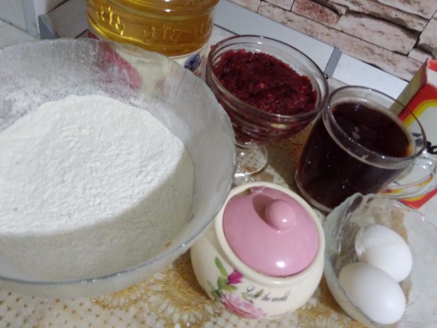 2 яйца, стакан крепкой остывшей заварки, сахар стакан, мука стакана 1,5, чуть соды и ложка варенья.