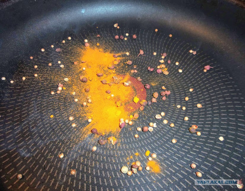 На сухой скороводе прогреть специи, истолочь в ступке.
