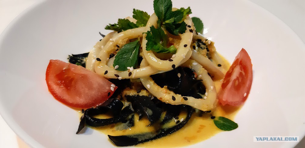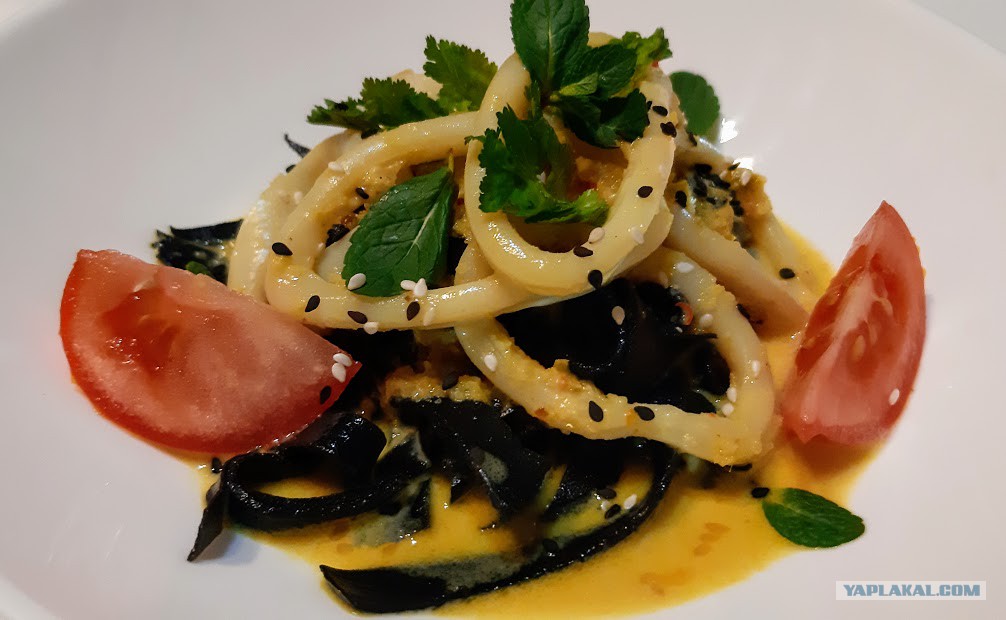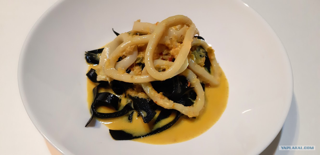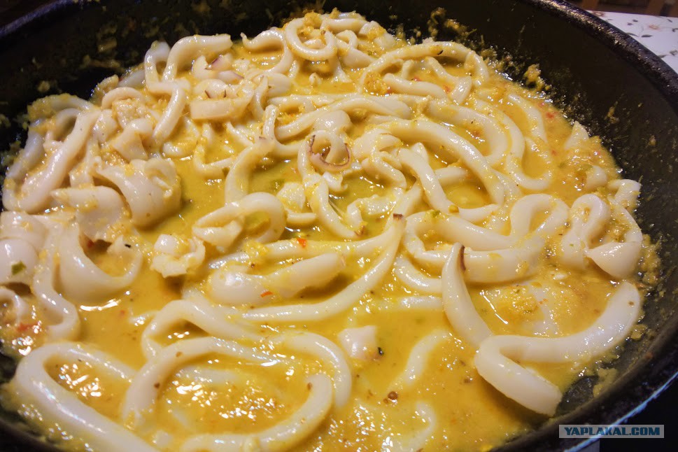 Добавить ошпаренные кальмары и прогреть ещё 3-5 минут. Так кальмары останутся нежными. Ну вот и всё))), можно начинать собирать блюдо).