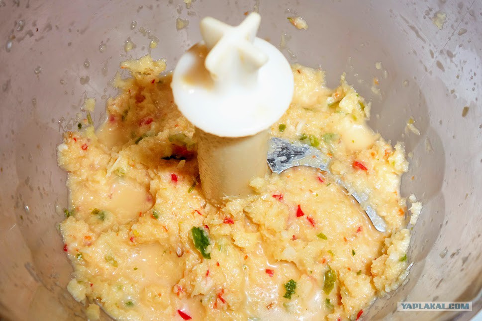 Теперь соус. В блендер сложить лемонграсс, галангал, листья кафирлайма, цедру лайма, перчик чили и лук. Перец регулируйте по своему вкусу.