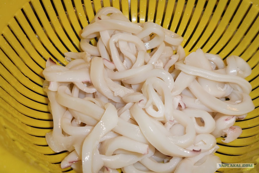 Кальмары нарезать кольцами, опустить на минуту в кипяток, откинуть на дуршлаг.