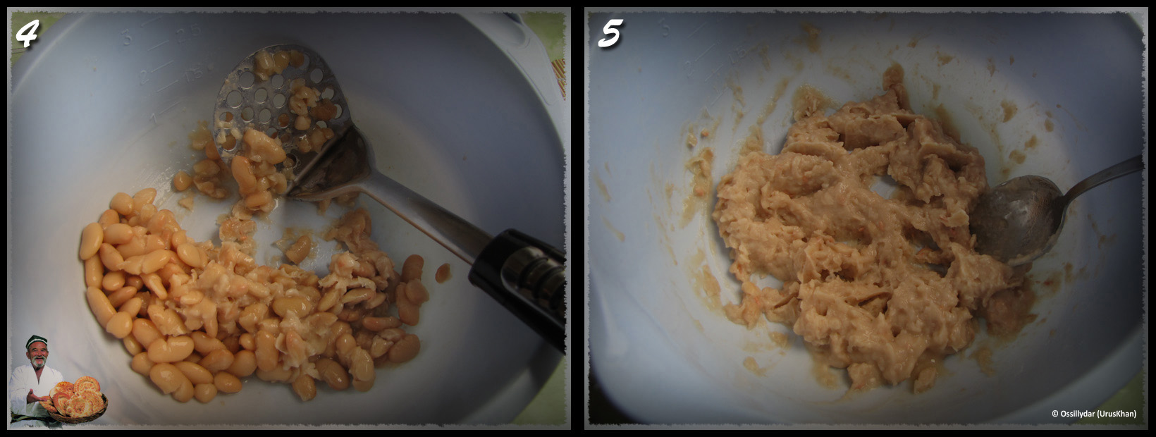 Займёмся кляром. Консервированную фасоль разомнем в чашке. Конечно, можно и отблендерить, "запрепюрировав" её, но я хотел получить более "грубый" кляр. Кто то может возразить, что пользовать "магазинную консервированную фасоль не комильфо, и нужно было сварить самому..." Возможно. Но... делайте и творение в студию.