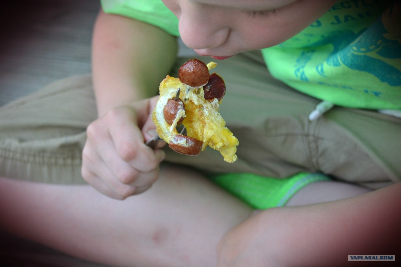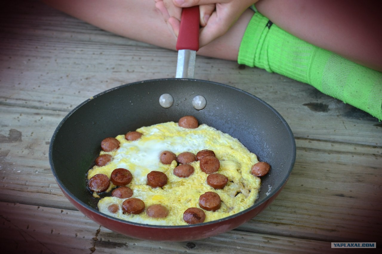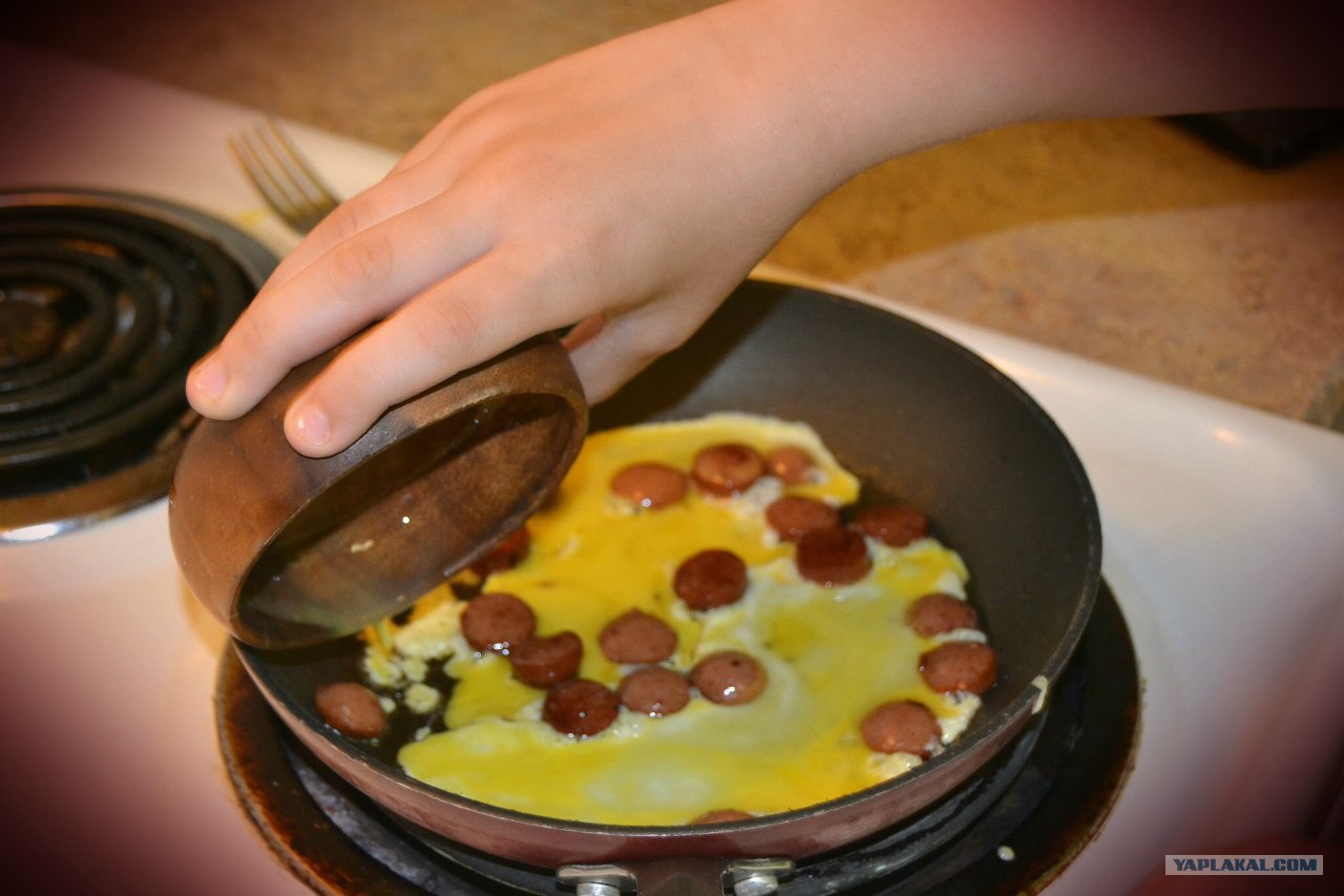 Яичница готова. Папа сказал, что настоящие мужики едят яичницу из сковородки, чтобы не пачкать тарелки.