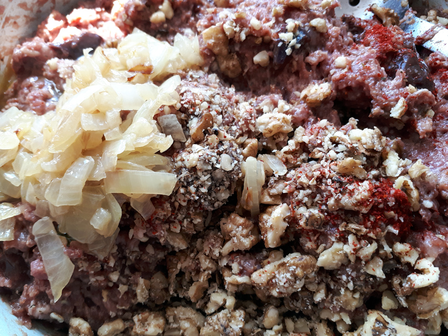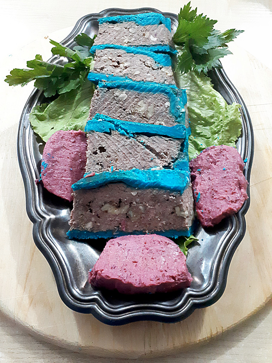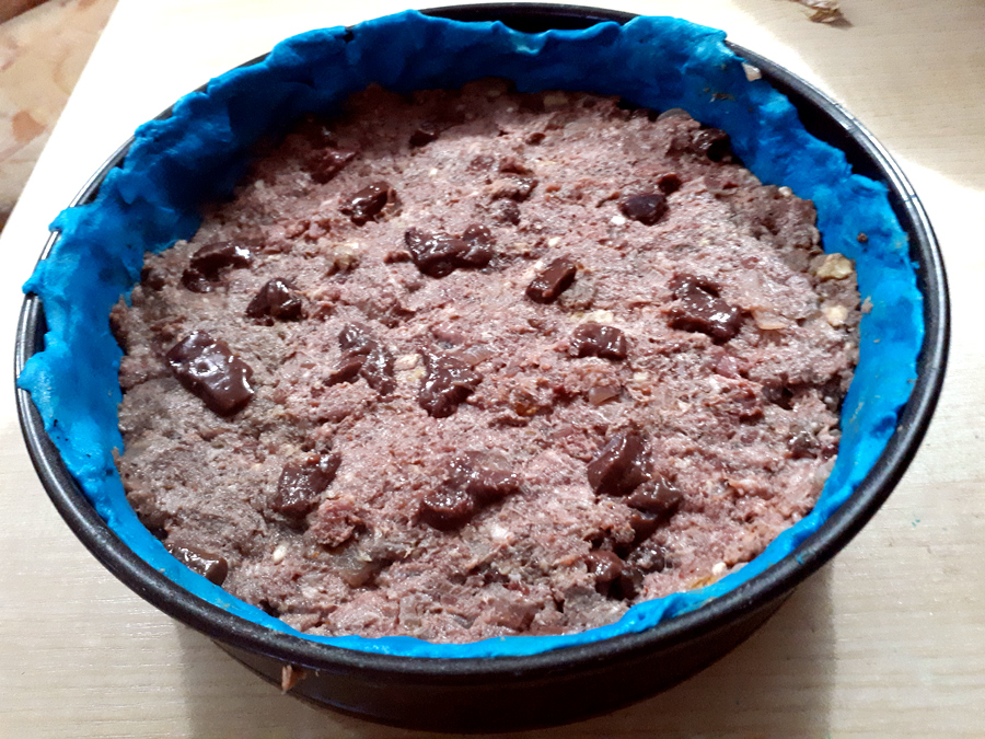 Теперь укладываю фарш, его можно уложить двумя слоями, между которыми выложить тонкий срез печени, который я отложил вначале приготовления. А можно и уложить фарш, сделать в нем канавку и "закопать" в него узкую ленточку печени.