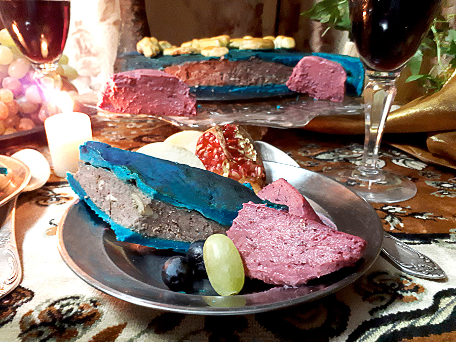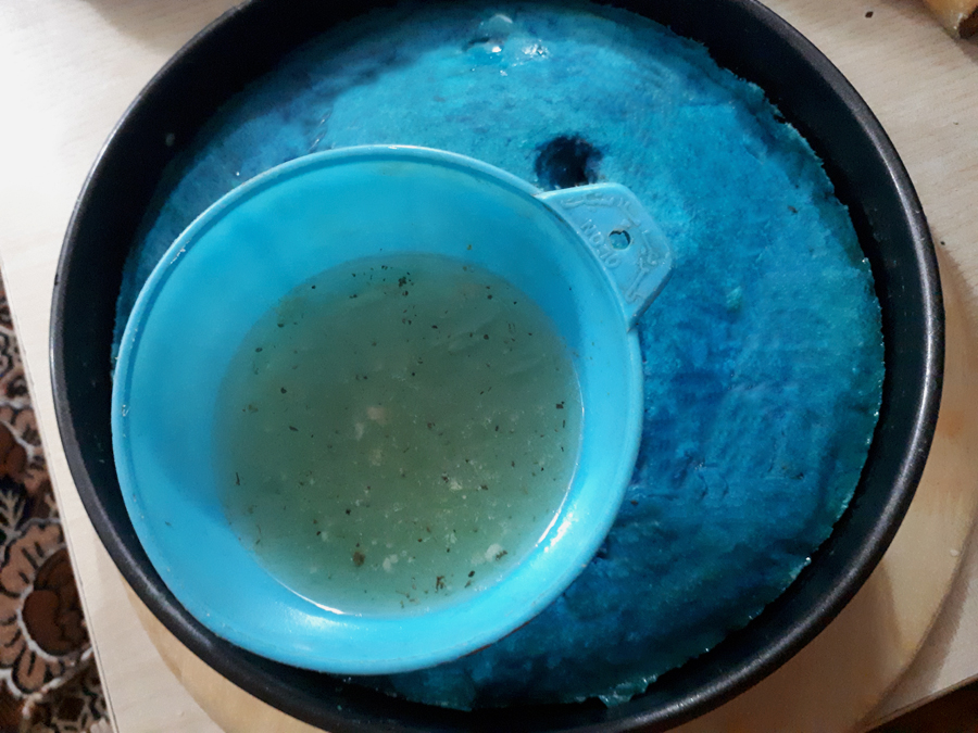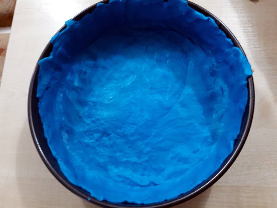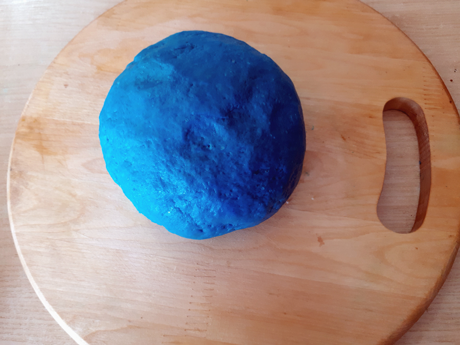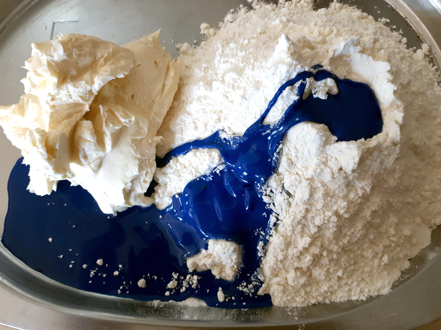Все долго и тщательно вымешиваю руками. Добавляю немного - около 20 мл молока - тесто станет чуть более податливым. Добавляю тертый корень индиго для светло- синего «королевского» цвета. Небольшой кусочек, для украшения, оставляю белым