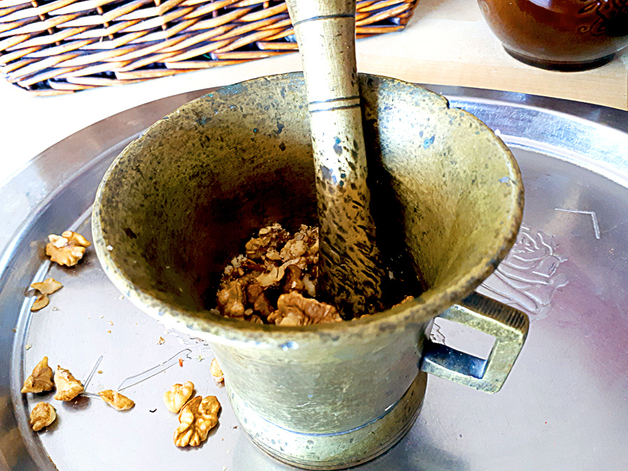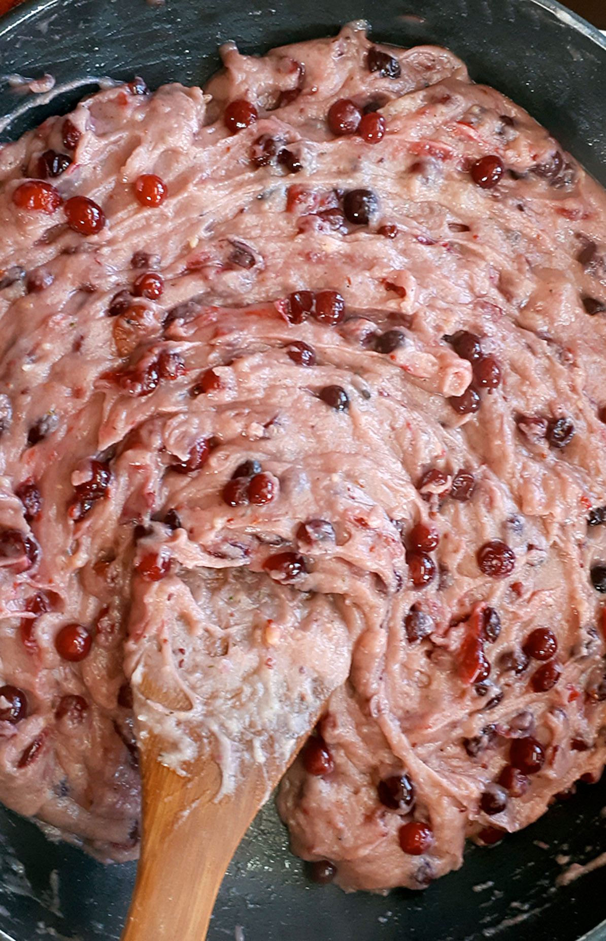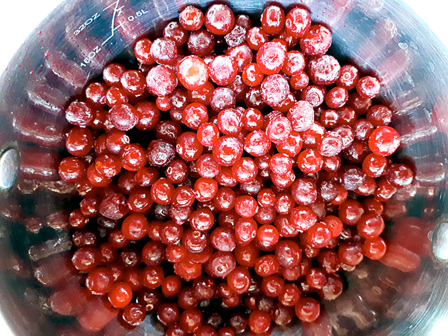 Растапливаю масло на сковороде, пережариваю две ложки муки, выливаю бульон, добавляю клюкву и орехи, вино, солю. Добавляю мед, затем муку. Соус должен быть розовым и густым . Все взбиваю, разбивая ягоды и превращая соус в густую красную однородную смесь.