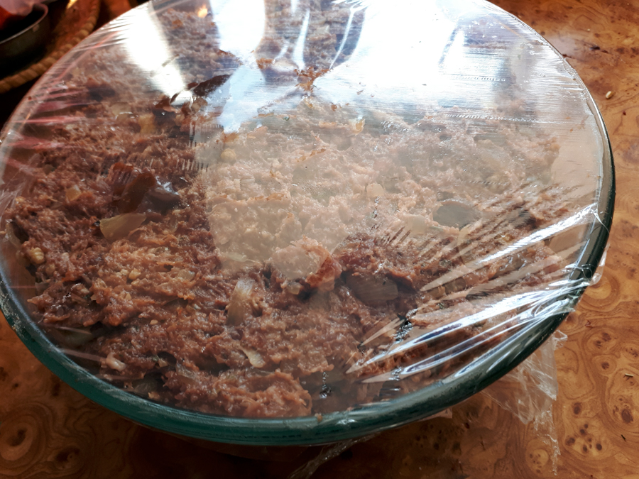 Добавляю маленькие кусочки печени и специи: мускатный орех, паприку, прованские травы, соль, белое сухое, коньяк. Все перемешав, оставляю настаиваться в прохладном месте около четырех часов.