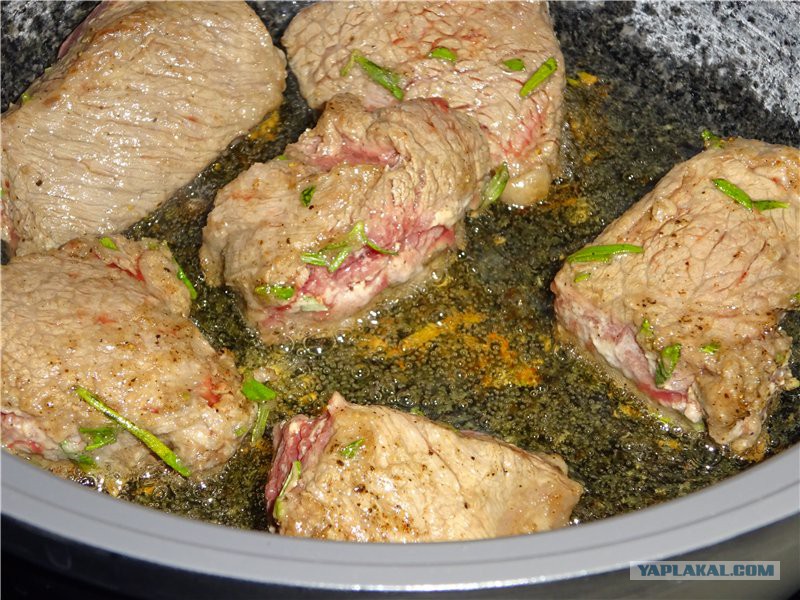 Тем временем сковородка раскалилась, масло в ней тоже. Быстро обжариваю мясо