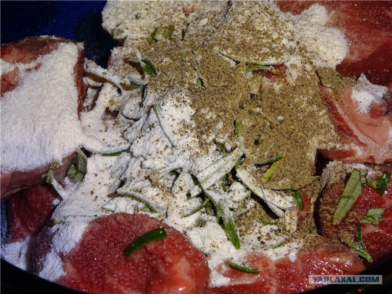 Мясо порезала достаточно крупно, сложила в мисочку, розмарин нарубила и к мясу, туда же ложку муки, соль и перец. Перемешала руками и отставила в сторону.