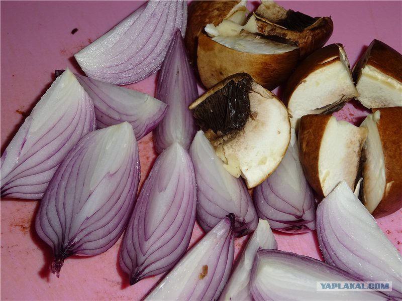 Поставила разогреваться сковородку с толстым дном, а сама занялась луком и грибами. Нарезала тоже достаточно крупно