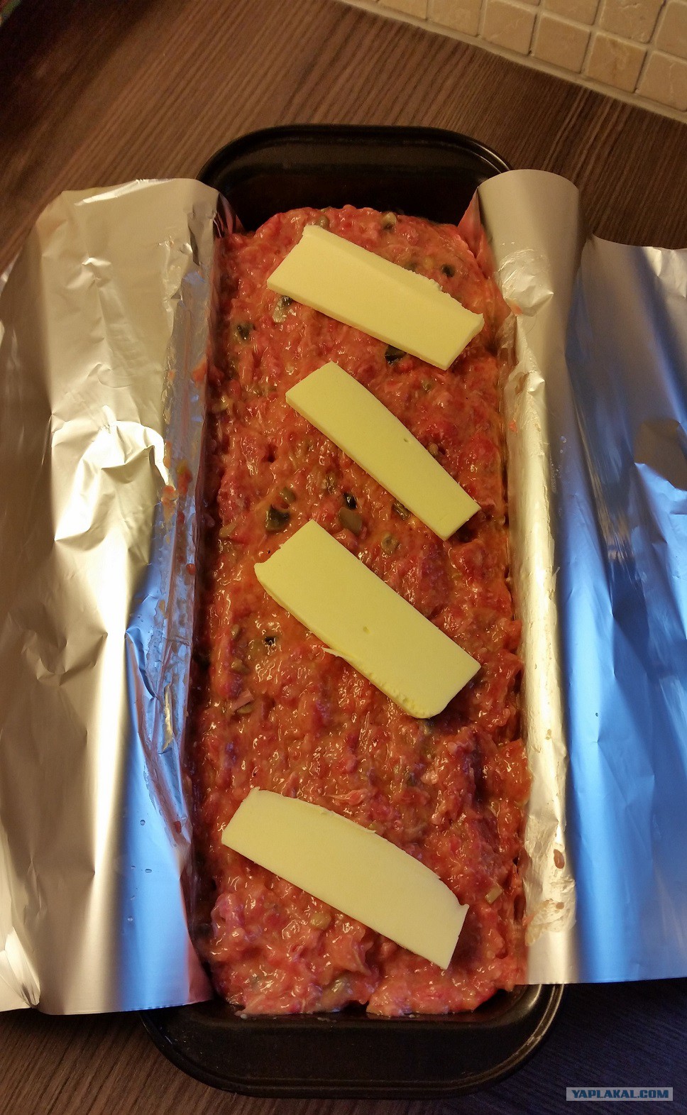 В форму, устеленную бумагой или фольгой, выкладываем фарш, не забыв положить несколько кусочков масла сверху. Закрываем верх пудинга бумагой или фольгой.