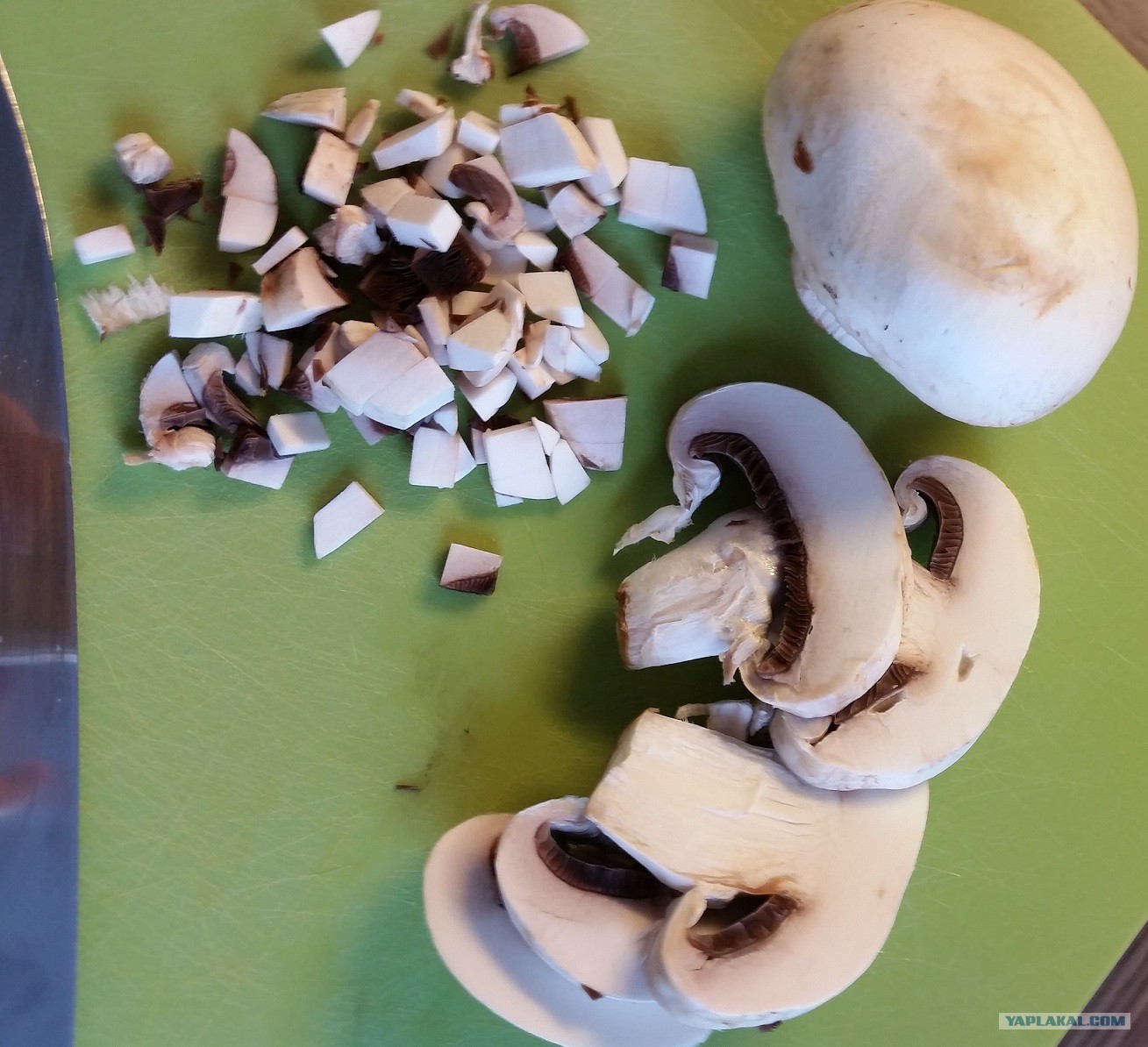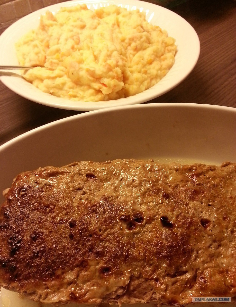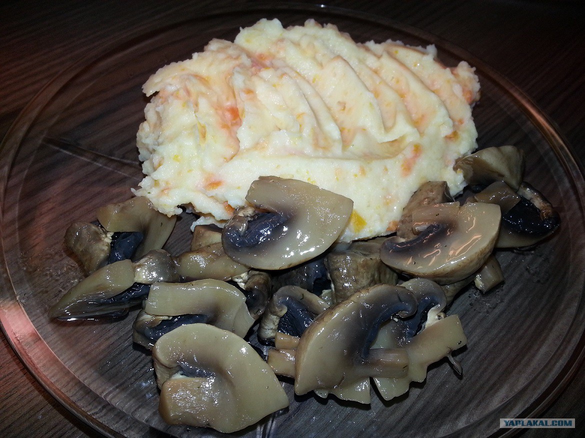 Получается блюдо такое: пудинг подается на блюде, каждый отрезает столько, сколько хочет, согласно своим желаниям. Картофельное пюре подается в отдельной глубокой чаше, опять же, кому сколько надо, сам зачерпнет гарнира. У нас на столе был мясной пудинг, картофельное пюре и маринованные шампиньоны.