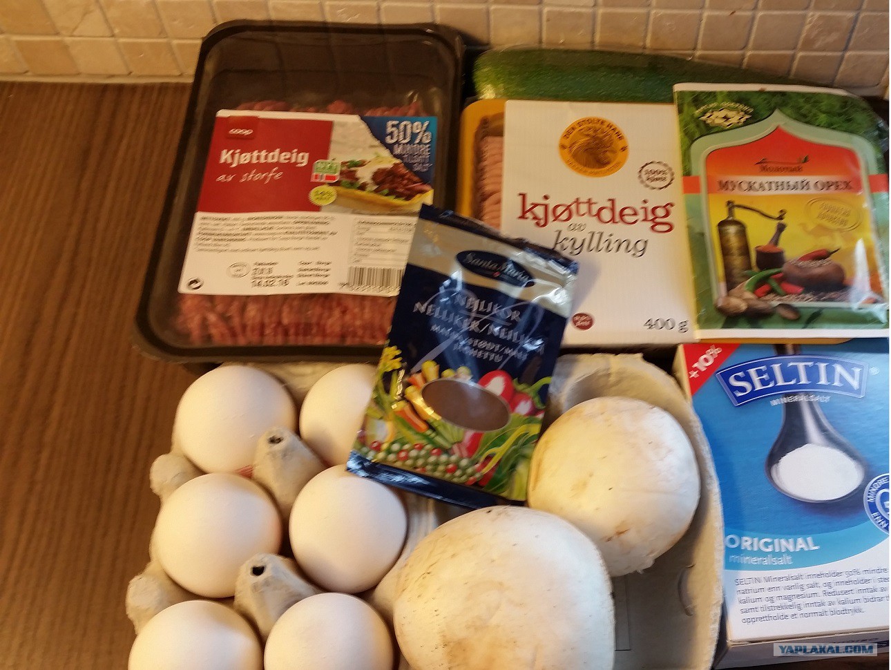 В этот раз я смешала говяжий фарш 800 граммов и 400 граммов куриного фарша. Также взяла 5 яиц, 2 больших шампиньона, кабачок, молотый мускатный орех, гвоздику, соль, перец.