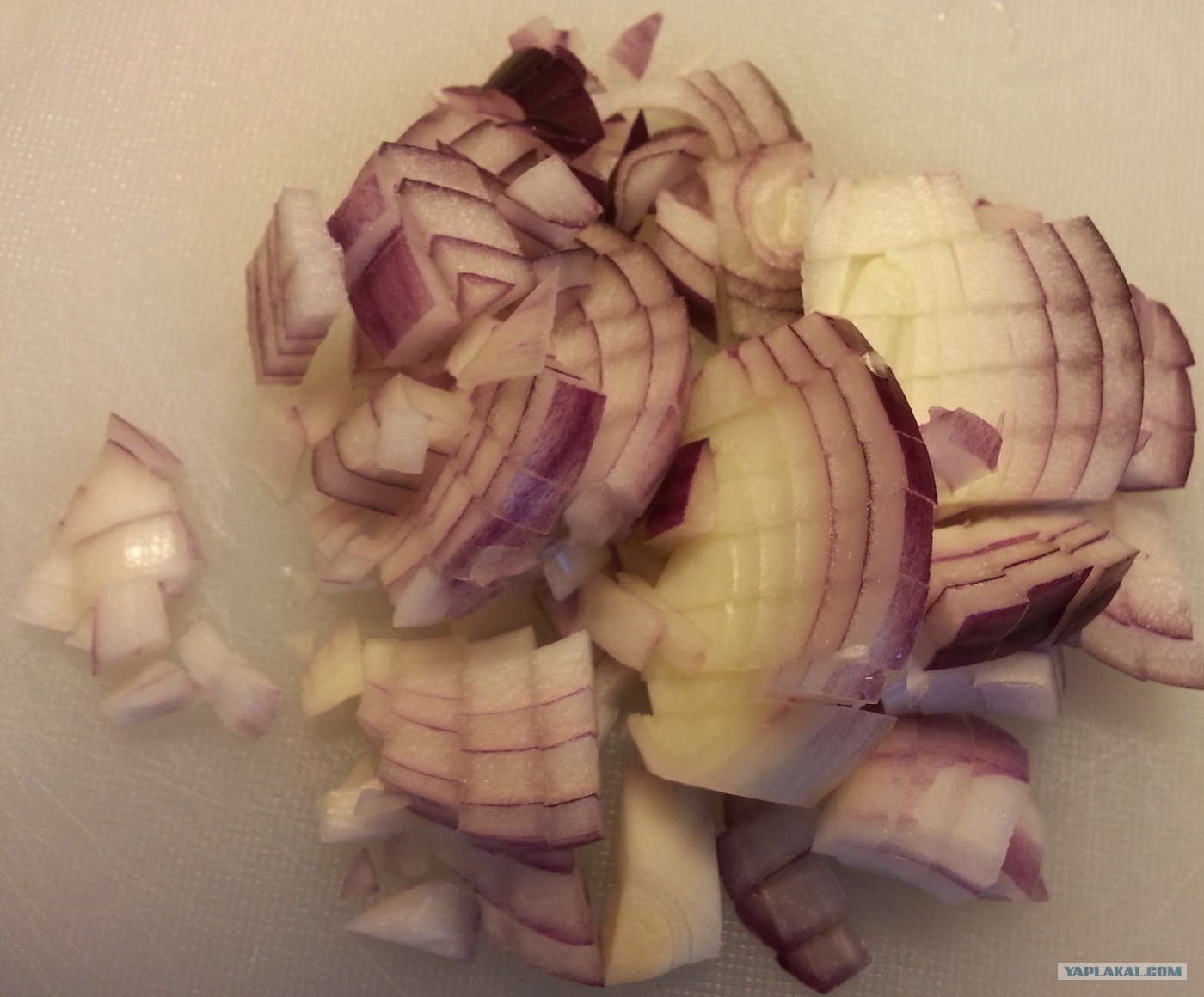 Нарежем лук мелко. Я не люблю слишком «злой» лук, поэтому, красный подходит лучше всего. Его можно пожарить, можно не жарить. По настроению. Мне нравится больше жареный, он лучше подходит по консистенции и вкусу. Но, когда времени нет особо на готовку, и есть дела поважней, кладу в фарш не жареный лук.