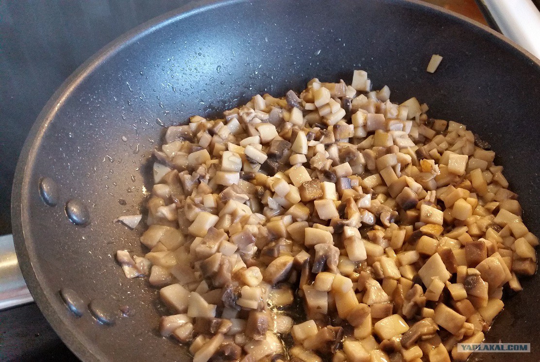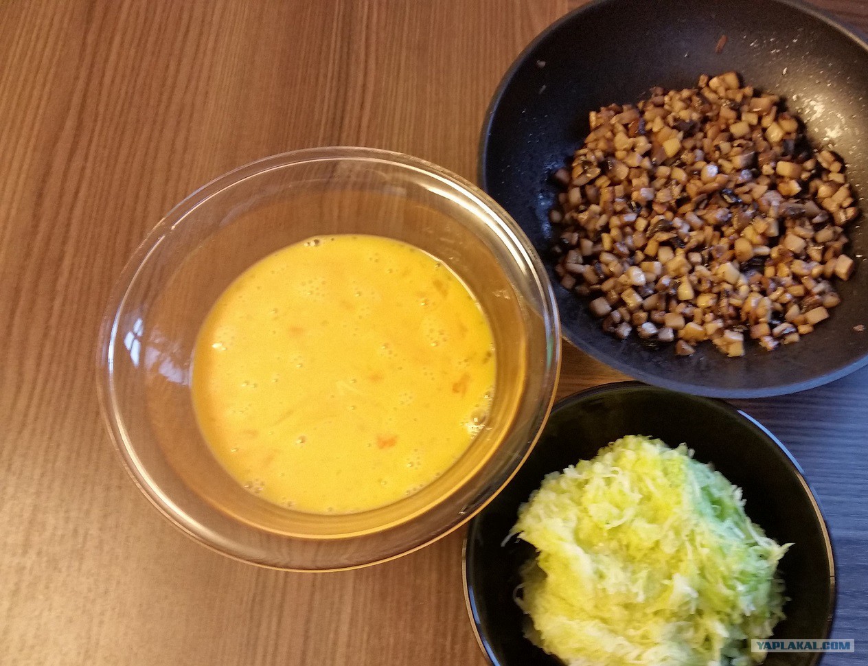 Кабачок, яйца, жареные грибы пойдут в фарш вместе.