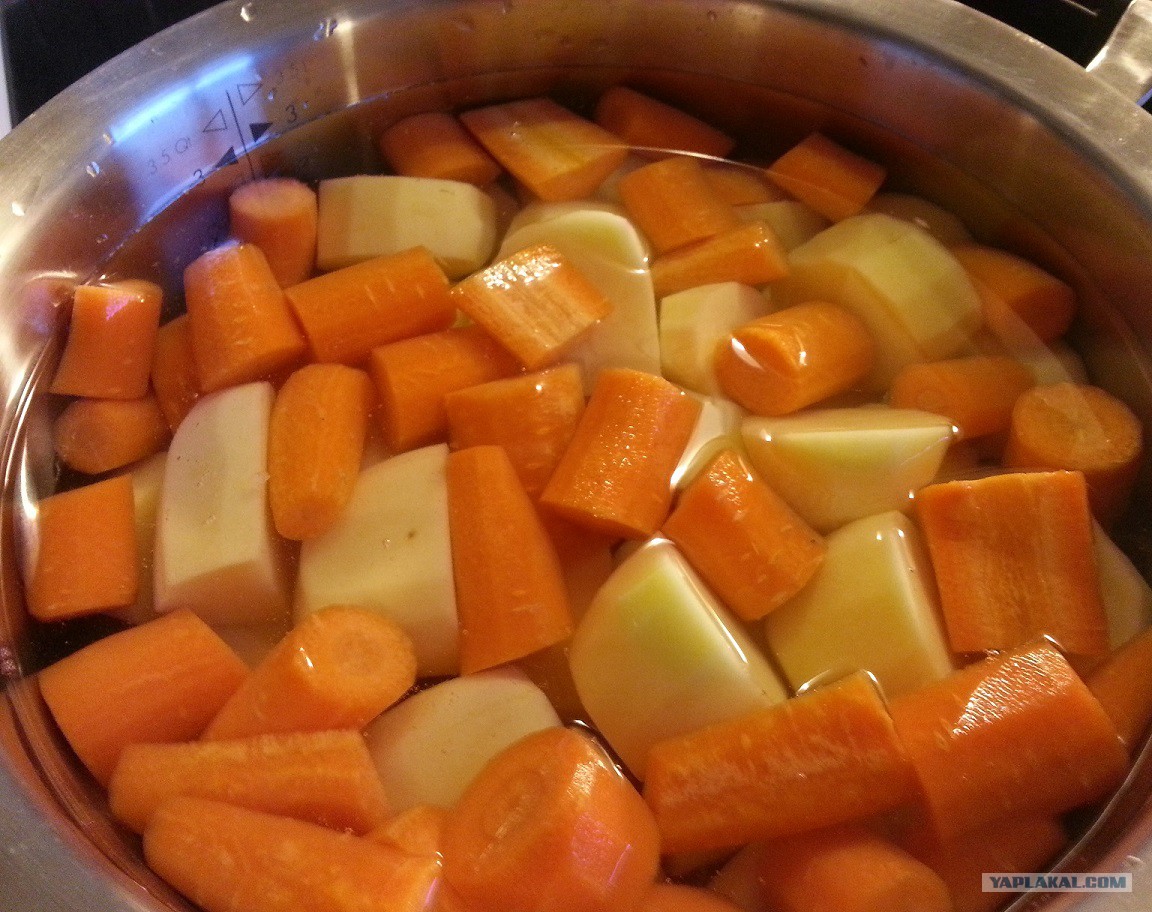 Для этого пюре нам потребуется 2/3 количества картофеля и 1/3 моркови. Я морковь кладу наверх, она варится дольше, поэтому, режется мельче, чем картофель, и я проверяю ее готовность через минут 20 после закипания. Остальное — как вы привыкли делать ваше любимое картофельное пюре. Норвежцы мои не солят картофель, когда варят, а непосредственно, когда мнут, добавляют масло сливочное, молоко, солят, перчат. Все по вашему индивидуальному вкусу.