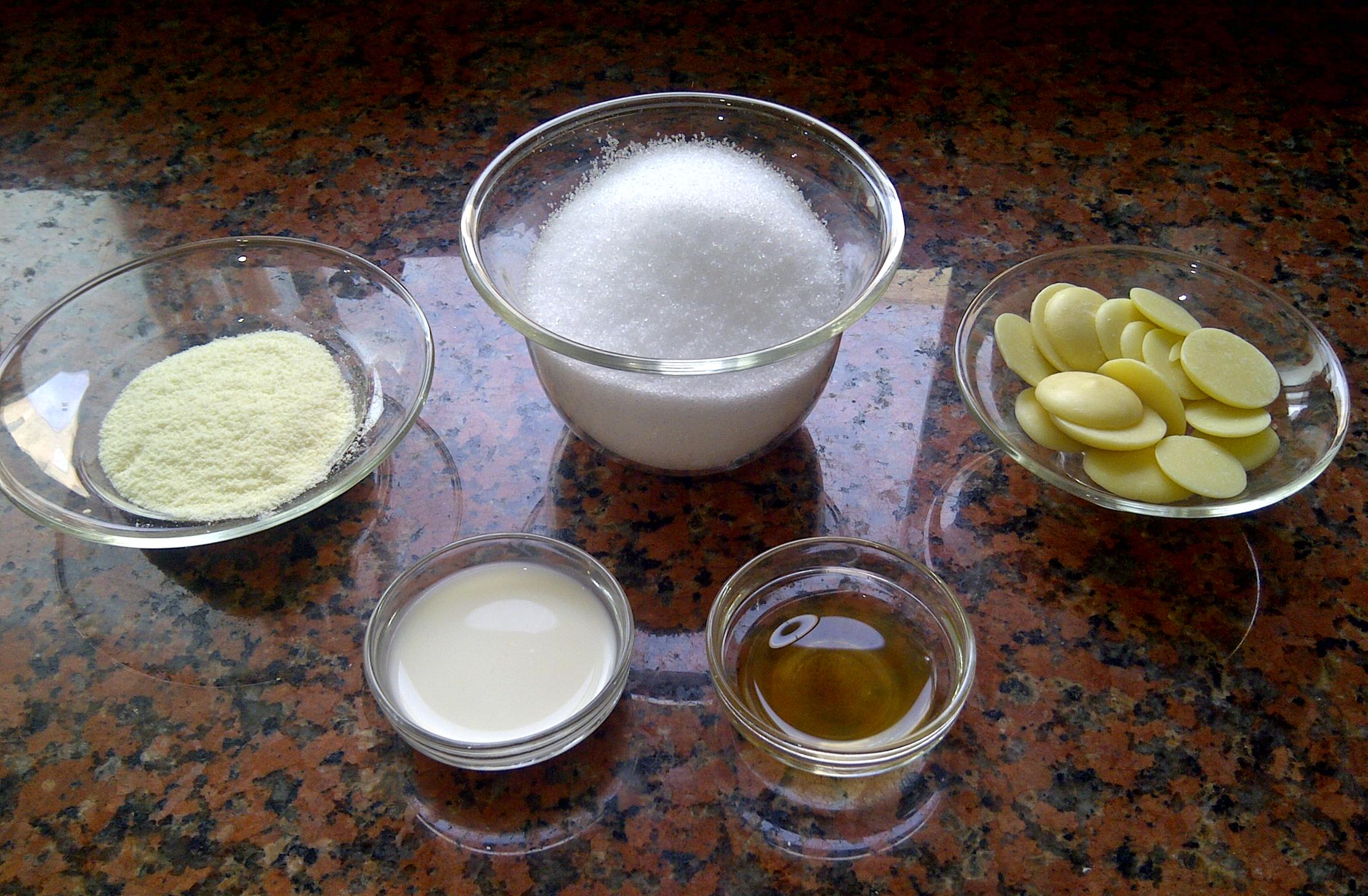 Хотя там не сложно - раззюзяем масло какао на водяной бане, и добавляем туда молотый в пудру, ваниль, и раззюзеный в сливках молочный порошок. Усё.