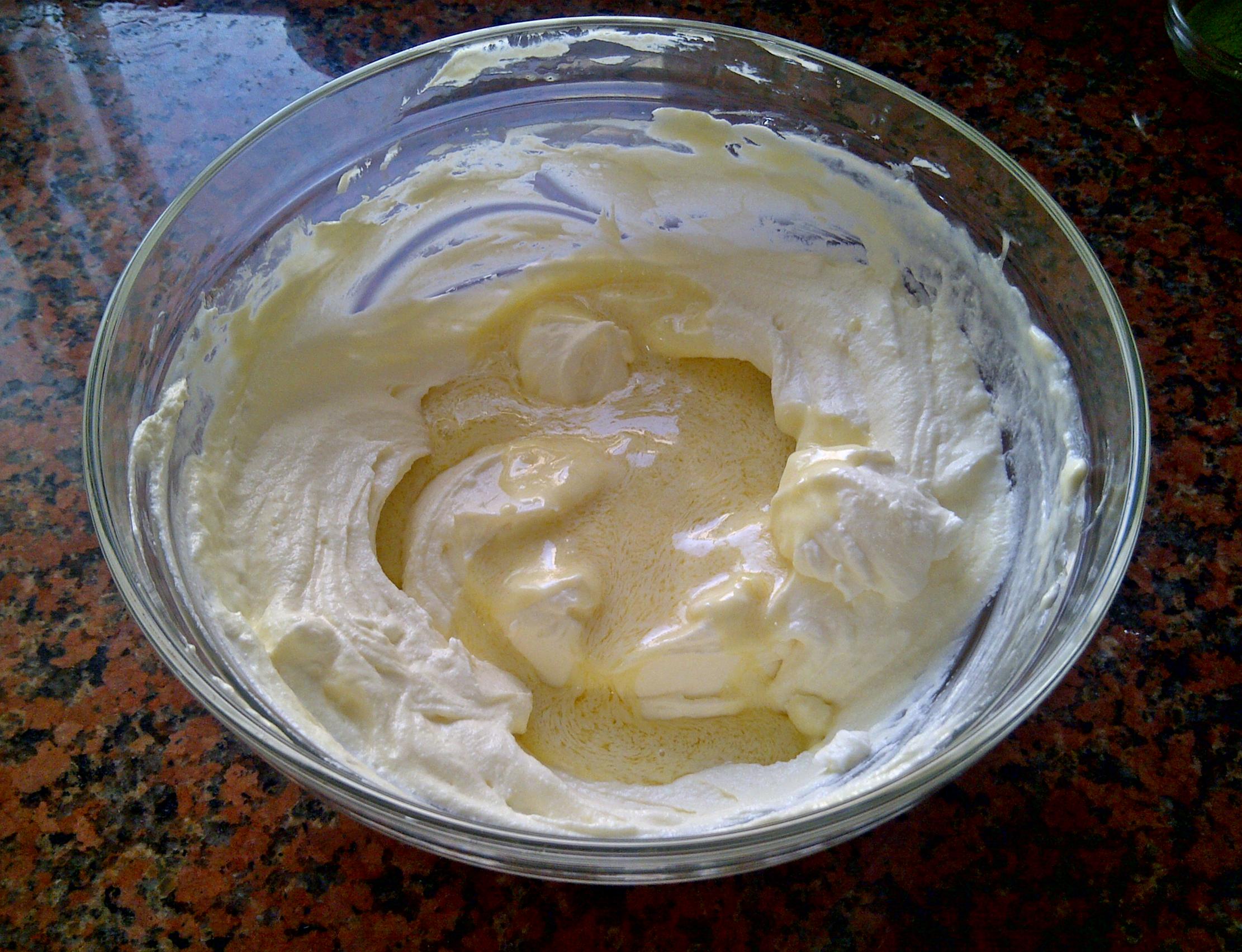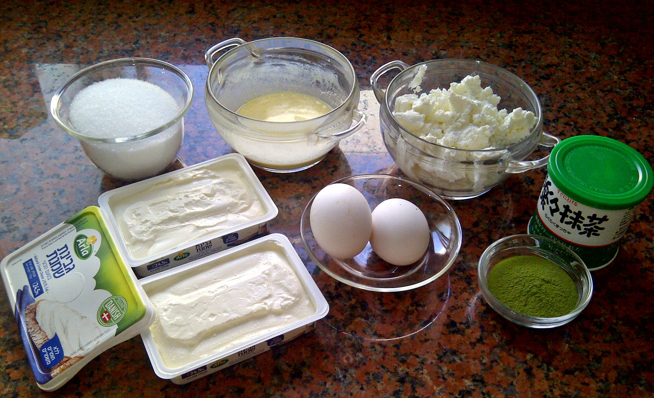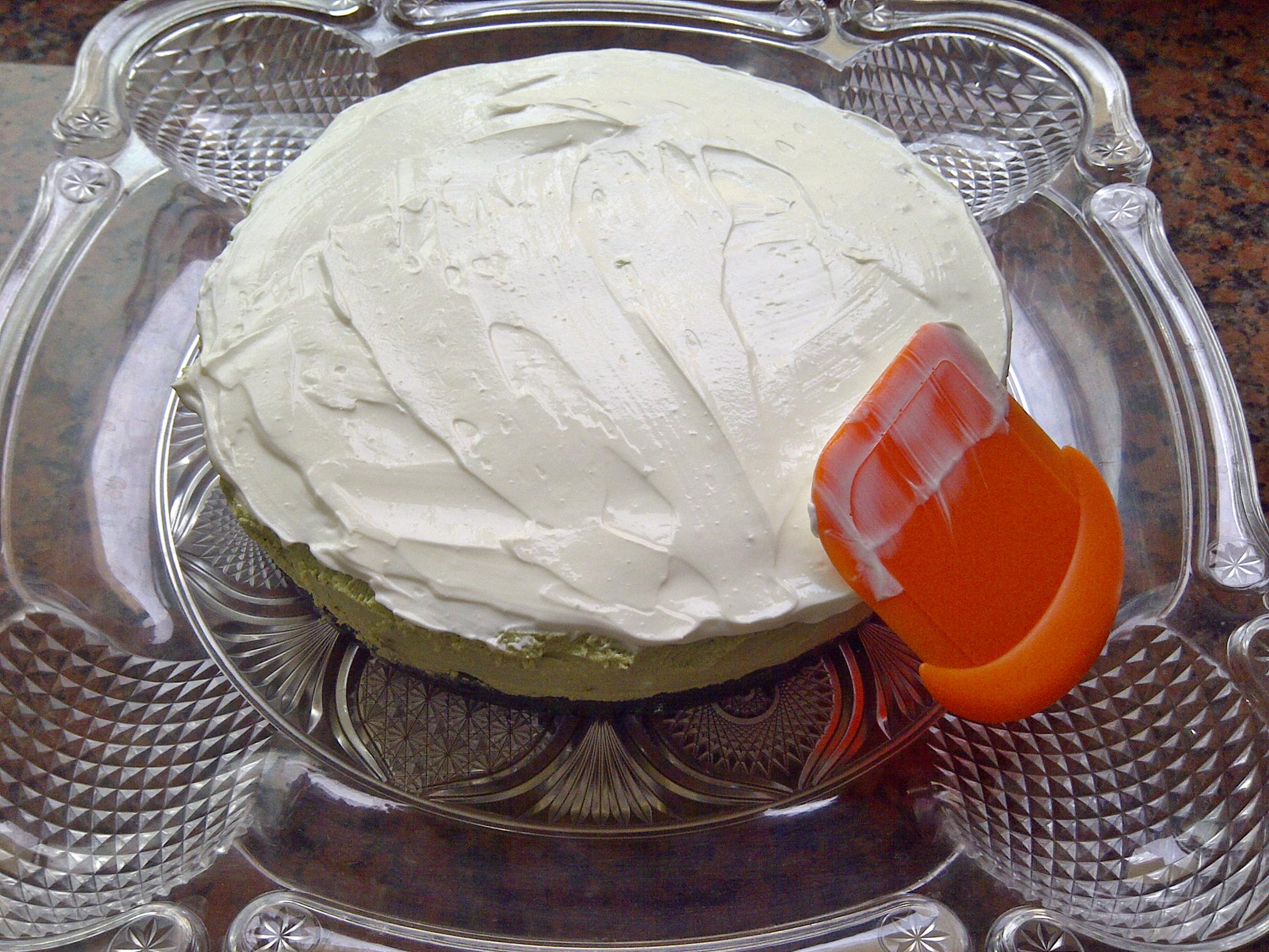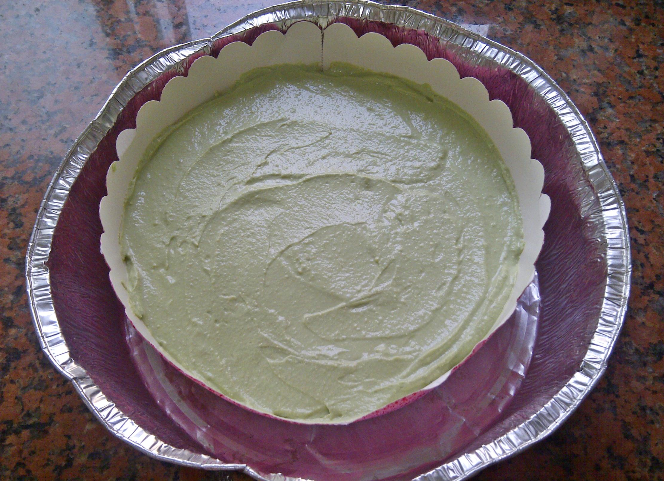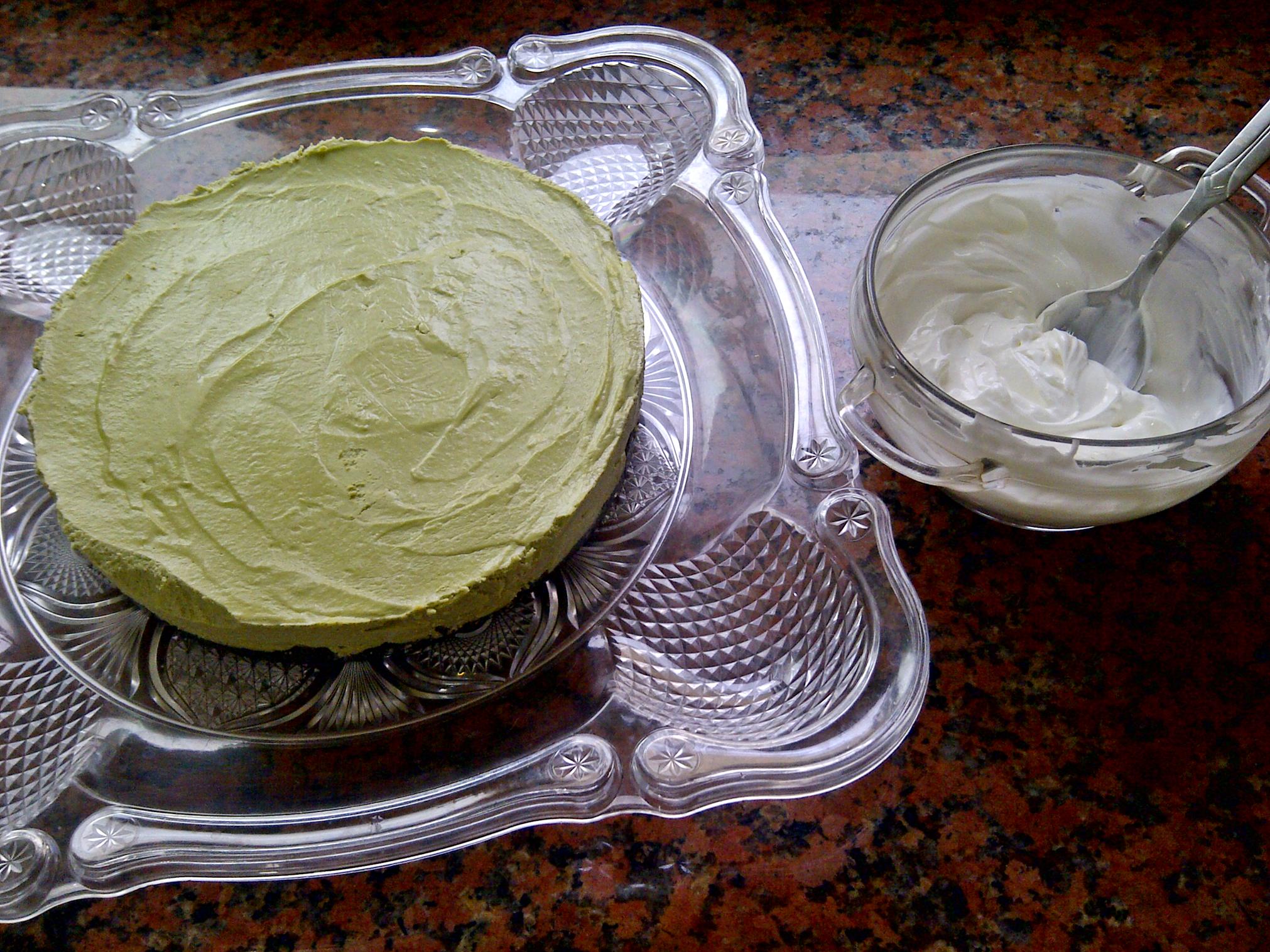 А теперь собственно творожная «суть» торта! Она у нас с зелёным этим японским чаем, и с белым шоколадом!