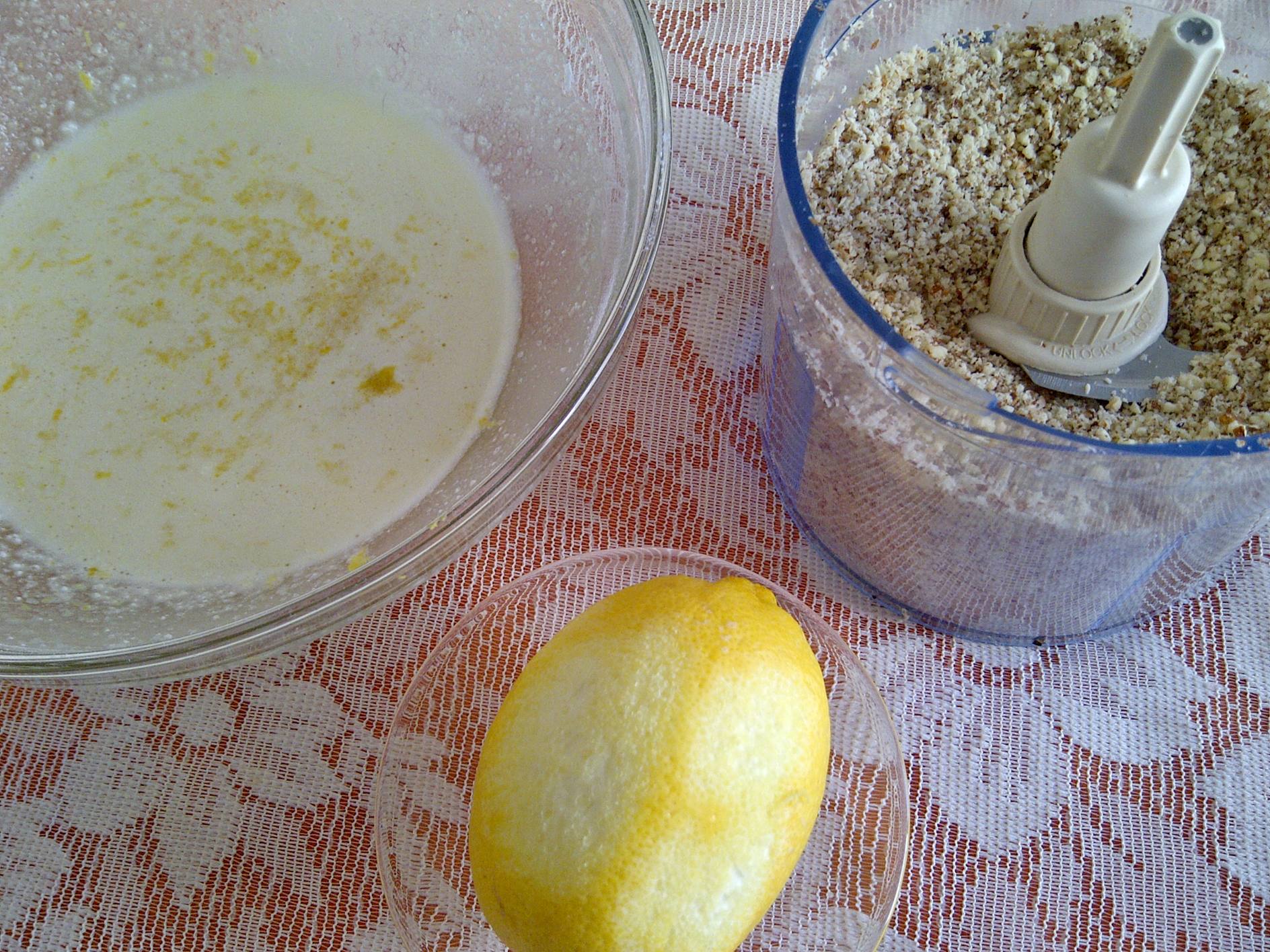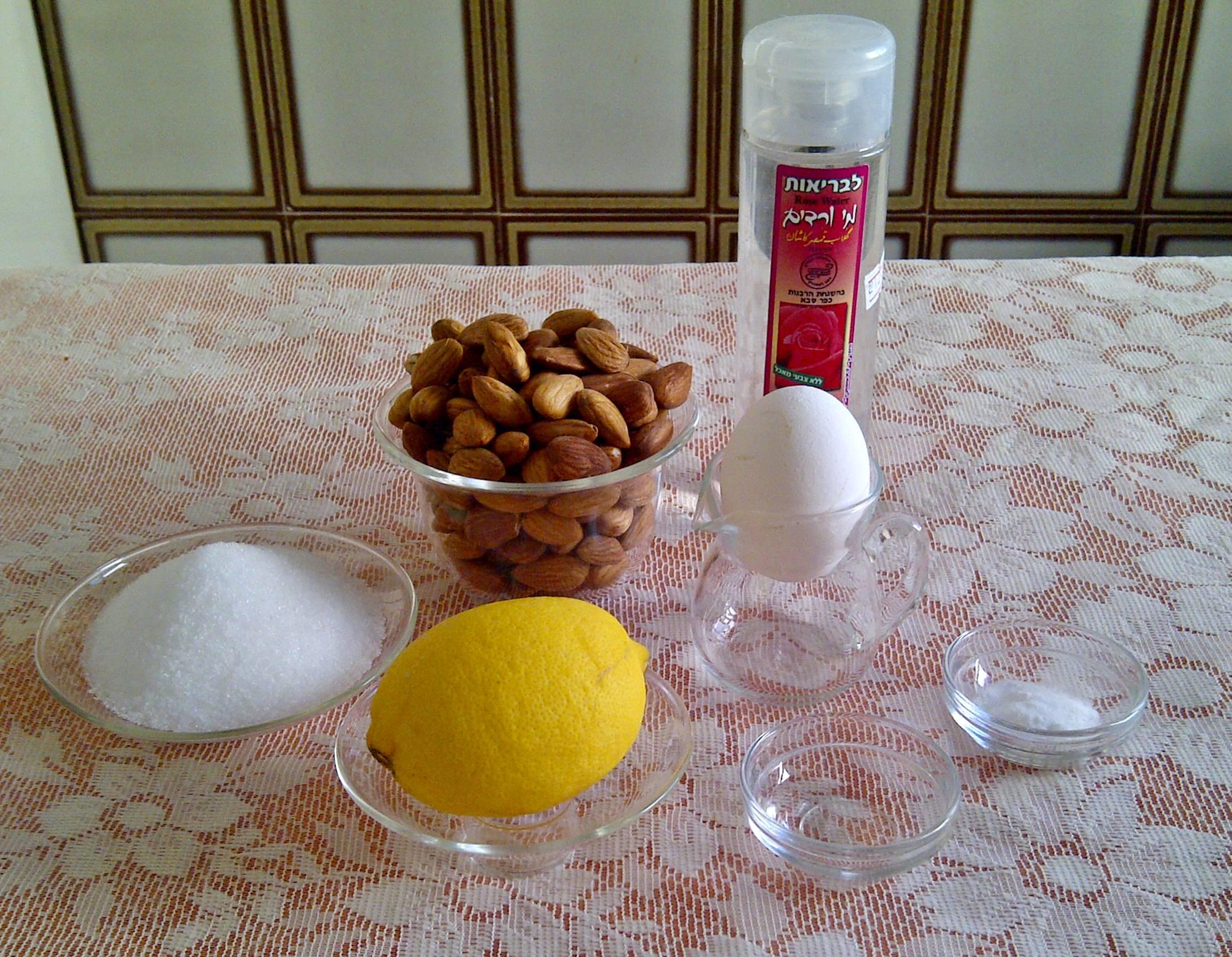 Для печенюх нам нужен миндаль, яйца, сахарная пудра, лимон, розовая вода, порошок для выпечки.