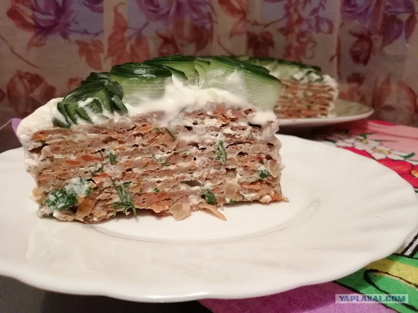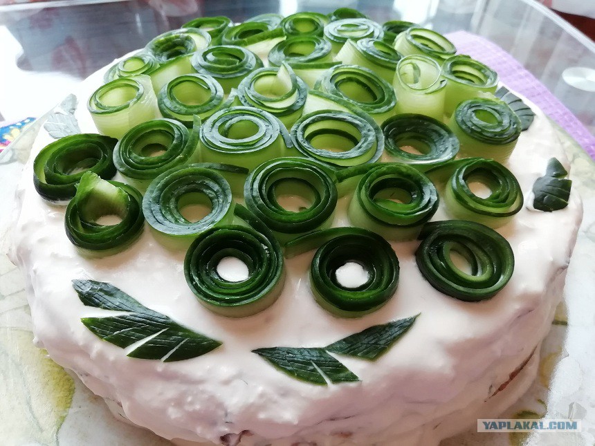 7. Получился довольно таки приличный по размеру тортик. Украсила его в меру своих способностей огурцом. Ещё одна нотка свежести.