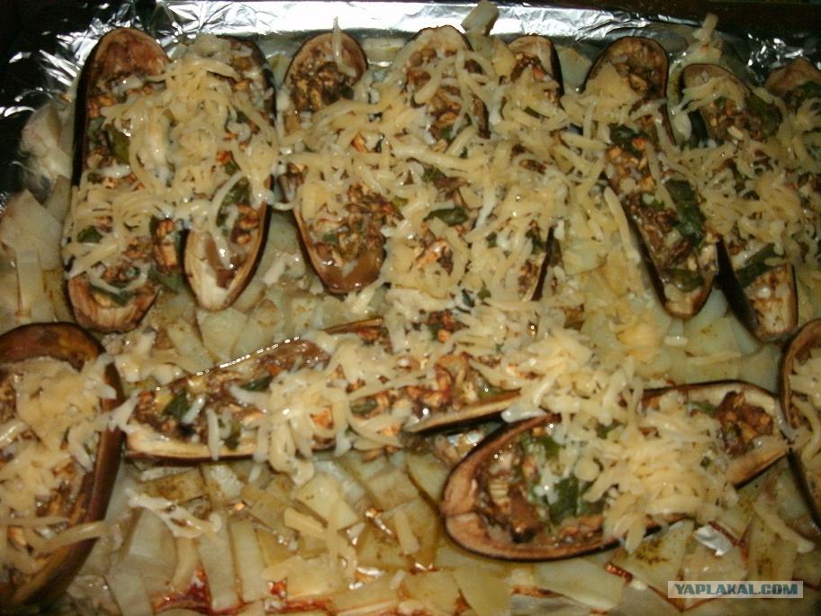Вот дальше лодочки нафаршировали и на картофельную подложку. По кусочку сливочного масла, чтоб не так постно было.