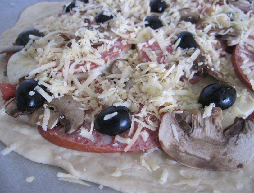 Нарезала шампиньоны, оливки пополам, выложила их на колбасу и засыпала натертым сыром. Пиццу поставила в духовке на 15 минут на высокую температуру.