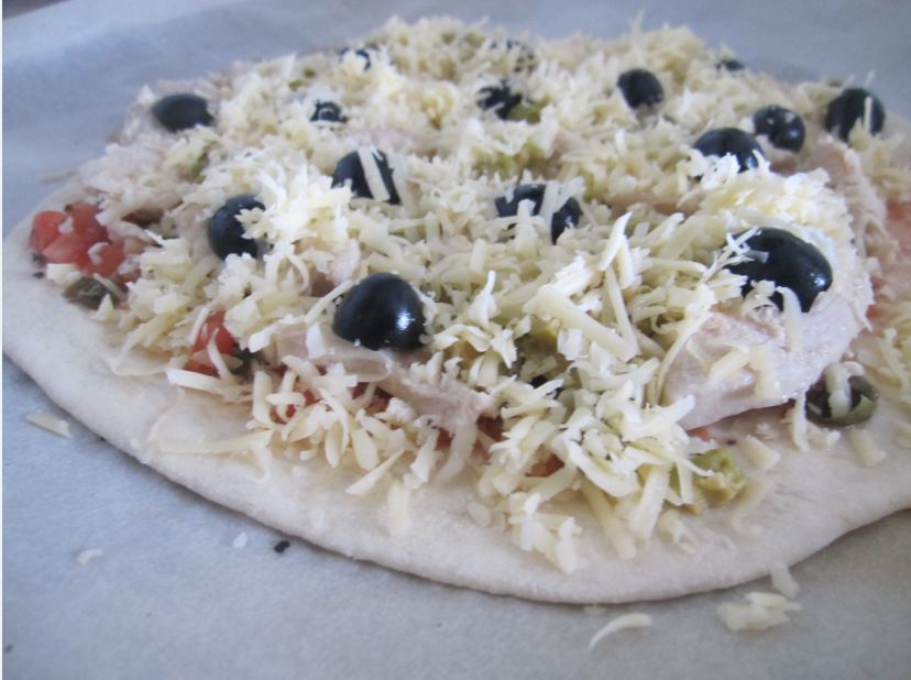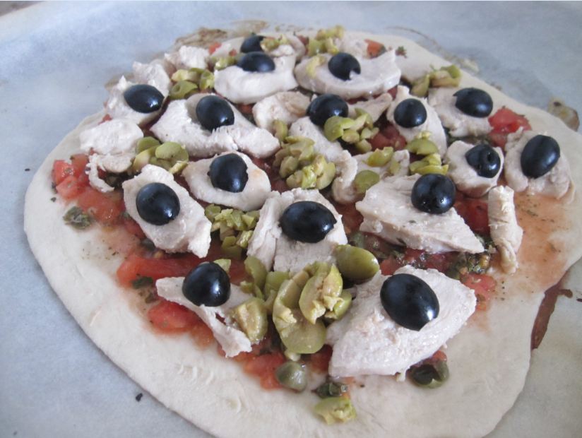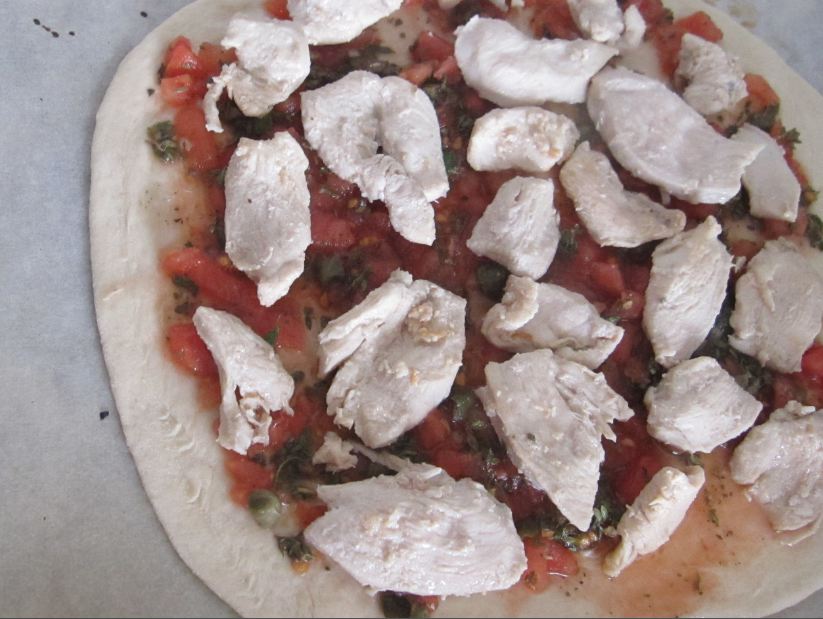 Третью пиццу я захотела с курицей. Для нее я немного обжарила куриное филе, на тесто выложила соус из помидор и филе.