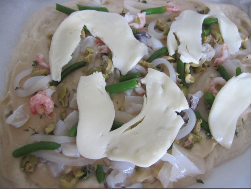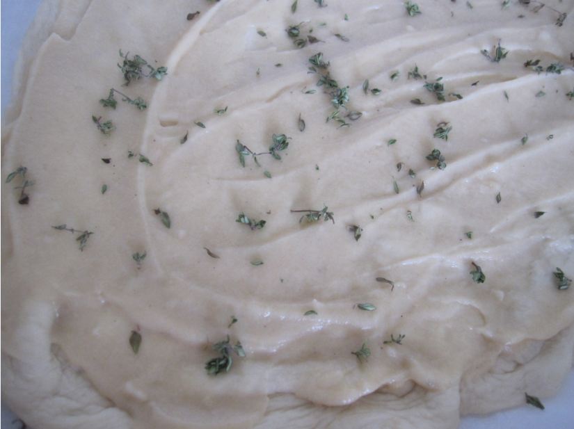 Пока первая пицца жарилась, я сделала «Морскую» пиццу. Для этого я сделала соус бешамель, выложила пару столовых ложек на тесто, посыпала немного листьями тимьяна