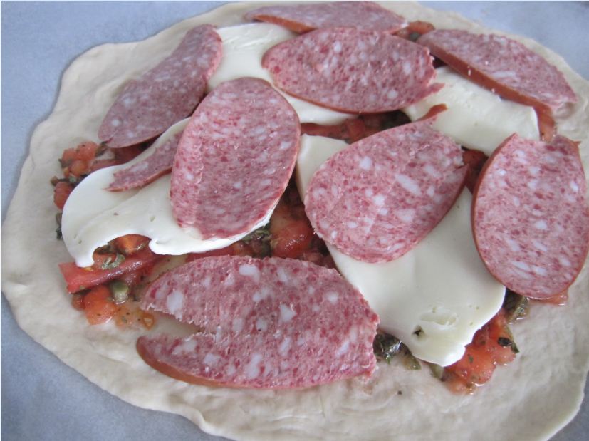 А на сыр несколько кружков колбасы